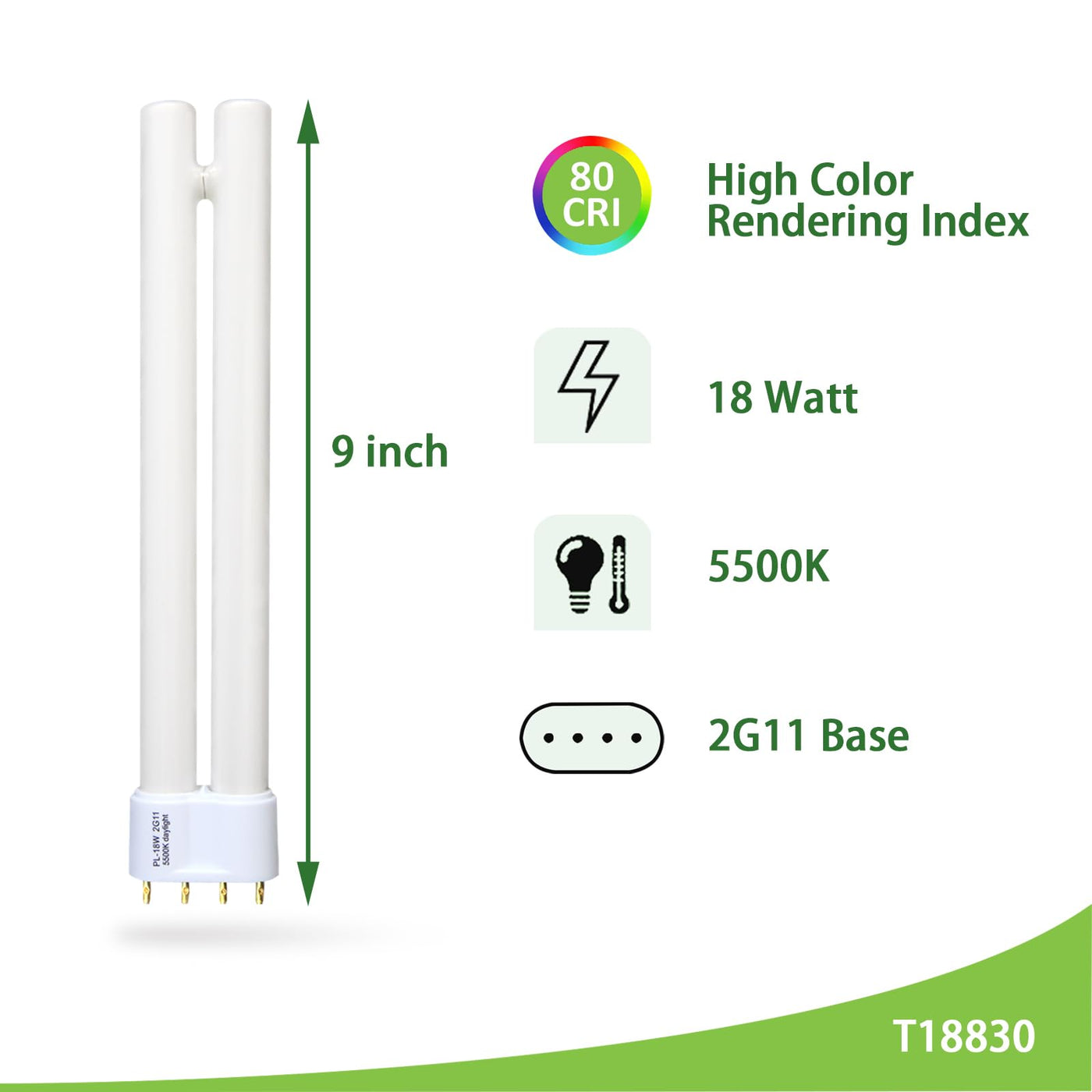 Q: What are the dimensions of the PL18-B-FFP bulb?A: The PL18-B-FFP bulb measures approximately 9 inches in length and has a width of 1.81 inches, designed to fit into fixtures that accommodate a 2G11 base.