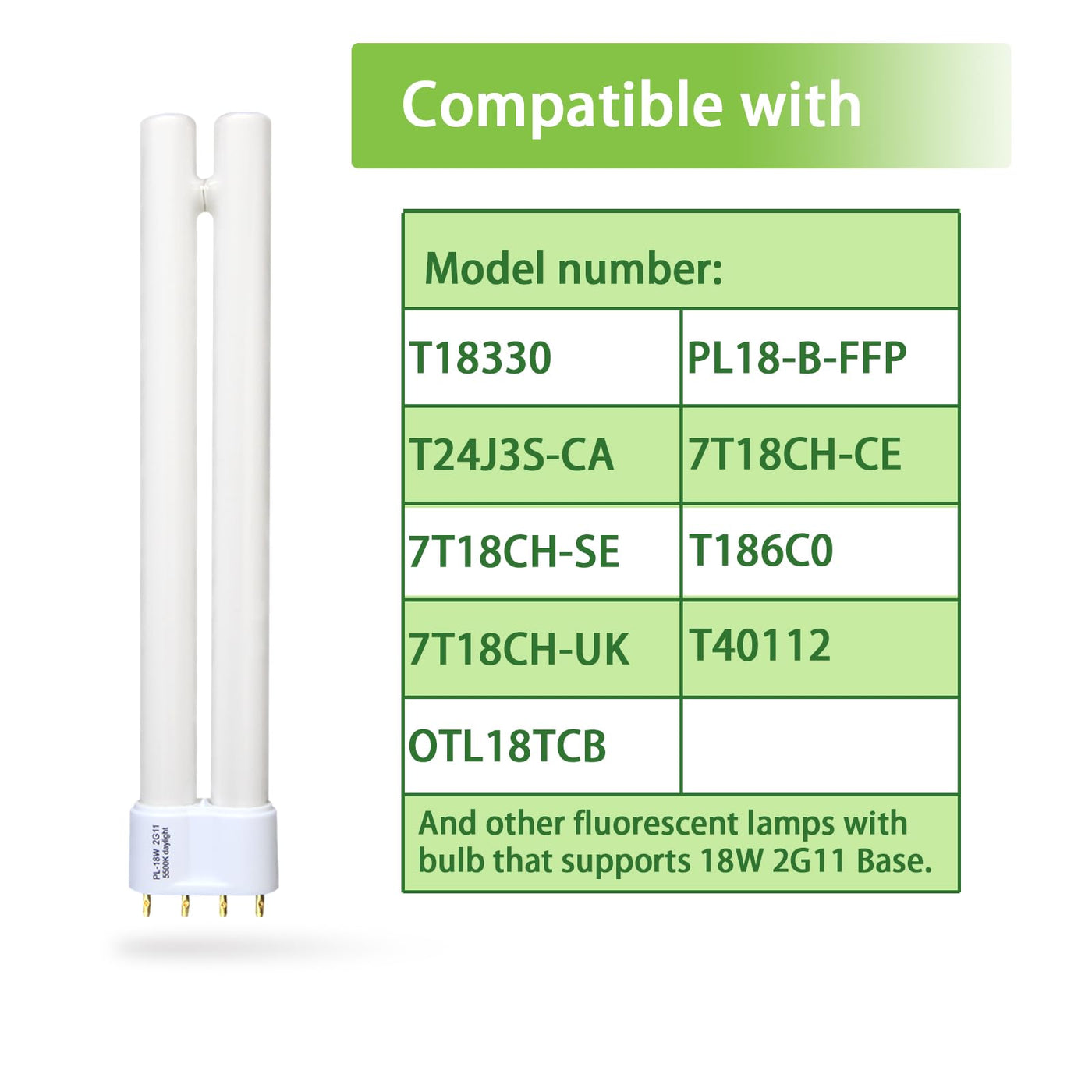 Q: Is the PL18-B-FFP bulb compatible with my OttLite lamp?A: Yes, the PL18-B-FFP is a replacement bulb for various OttLite lamp models including T18330, T186C0, and T40112, among others. Please verify the markings and measure your existing bulbs for compatibility.