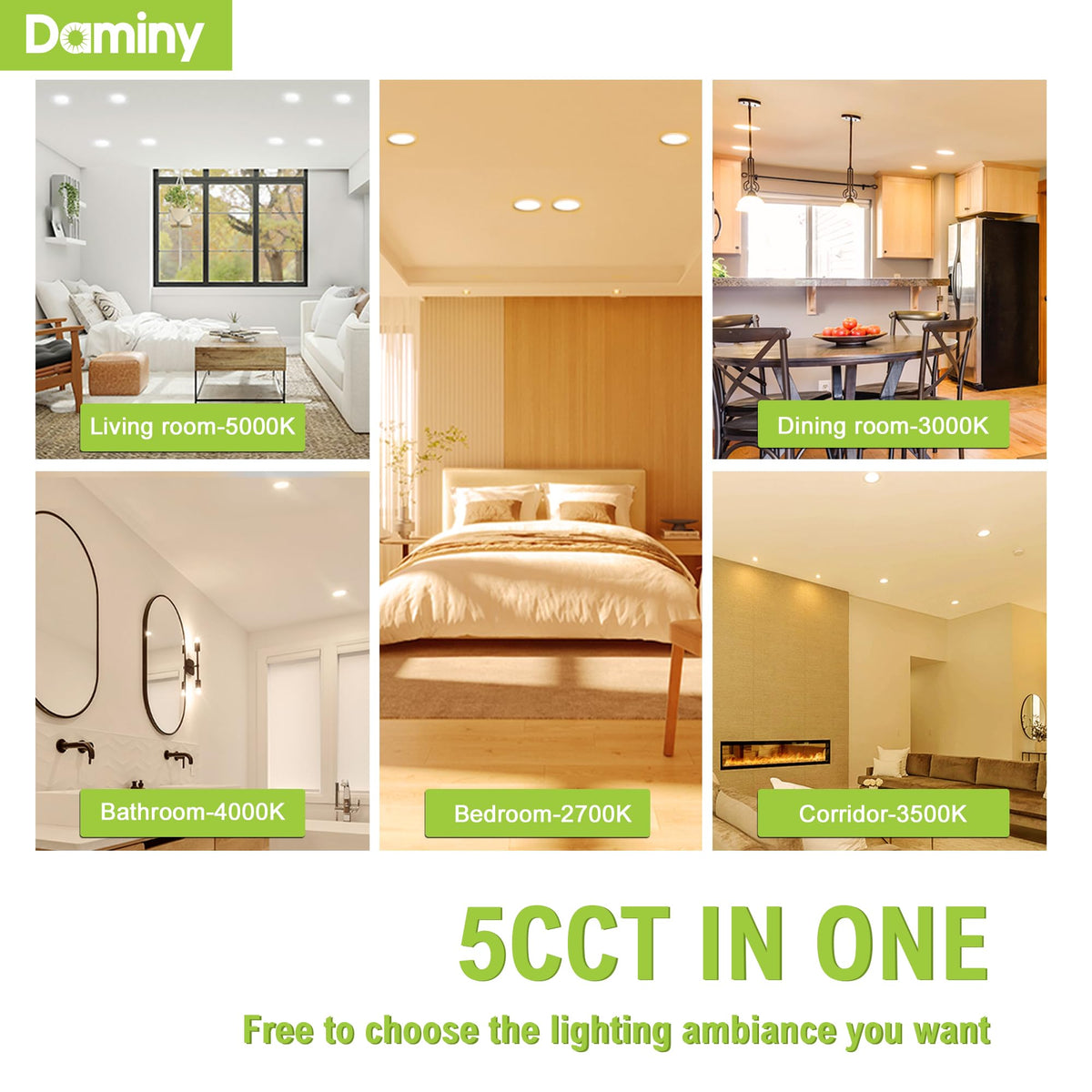 Q: What are the different color temperature options available for the DAMINY 6 inch LED recessed lights?A: The DAMINY 6 inch LED recessed lights offer five color temperature options, allowing you to choose your preferred lighting ambiance easily. This feature helps eliminate the hassle of returns or exchanges due to unsuitable color temperatures.