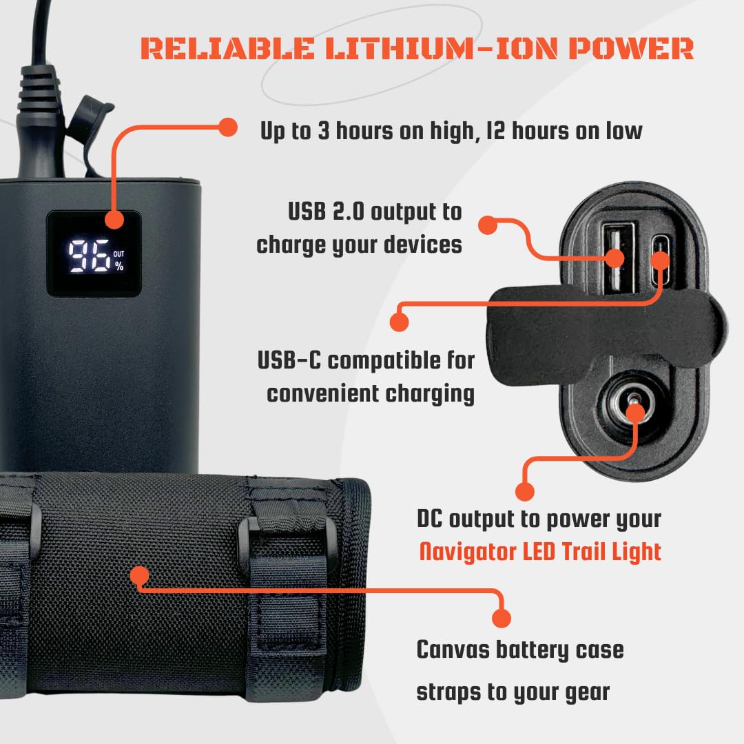The Navigator LED Trail Light features cutting-edge 2100 lumen rated LEDs utilizing high-performance Cree technology. This ensures maximum brightness to light up trails, campsites, and other hard-to-see areas. The ultra-low profile and lightweight aluminum housing minimize added weight, making it perfect for mounting on helmets. The included adhesive mounts allow for easy installation, while compatibility with action camera-style mounts provides versatile mounting options. The external lithium-ion rechargeable battery not only powers the light for over 3 hours on high and up to 12 hours on low but also serves as a power bank for charging other devices on the go.
