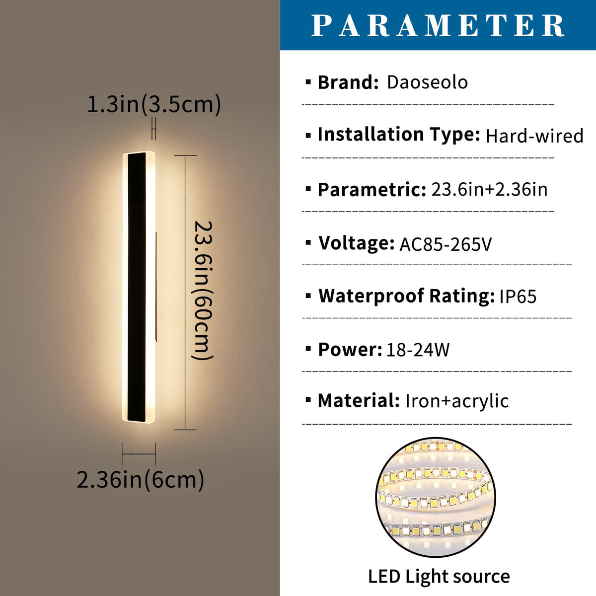 Q: Is the Daoseolo Outdoor Wall Light weather-resistant?A: Yes, the Daoseolo Outdoor Wall Light has an IP65 waterproof rating, making it suitable for various outdoor conditions. Its high-quality aluminum construction and high-translucent acrylic lampshade provide durability and weather resistance, ideal for patios, gardens, and garages.