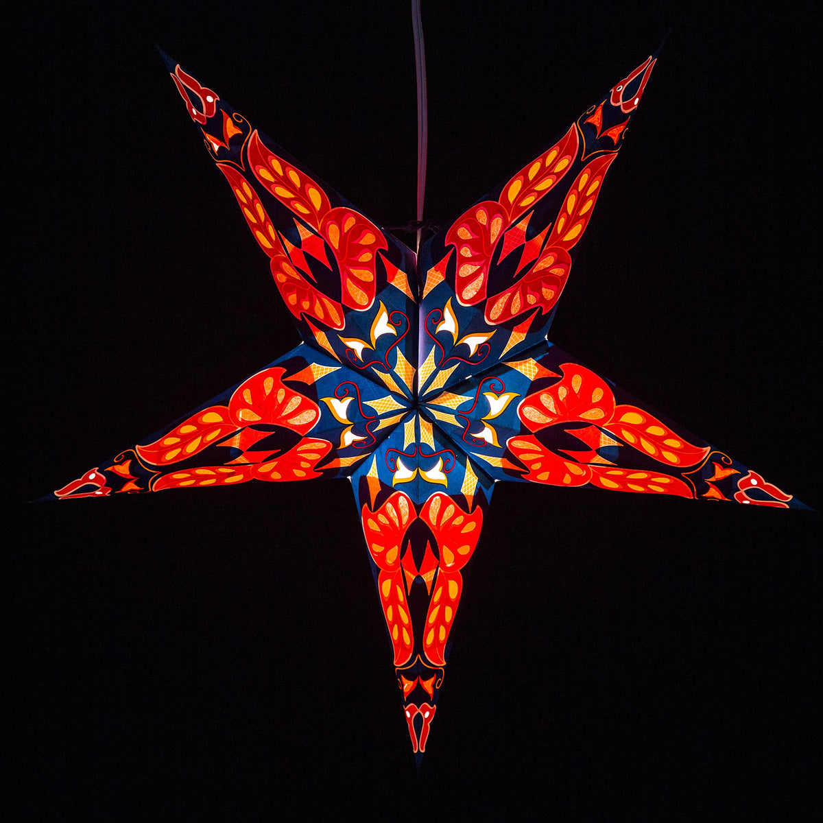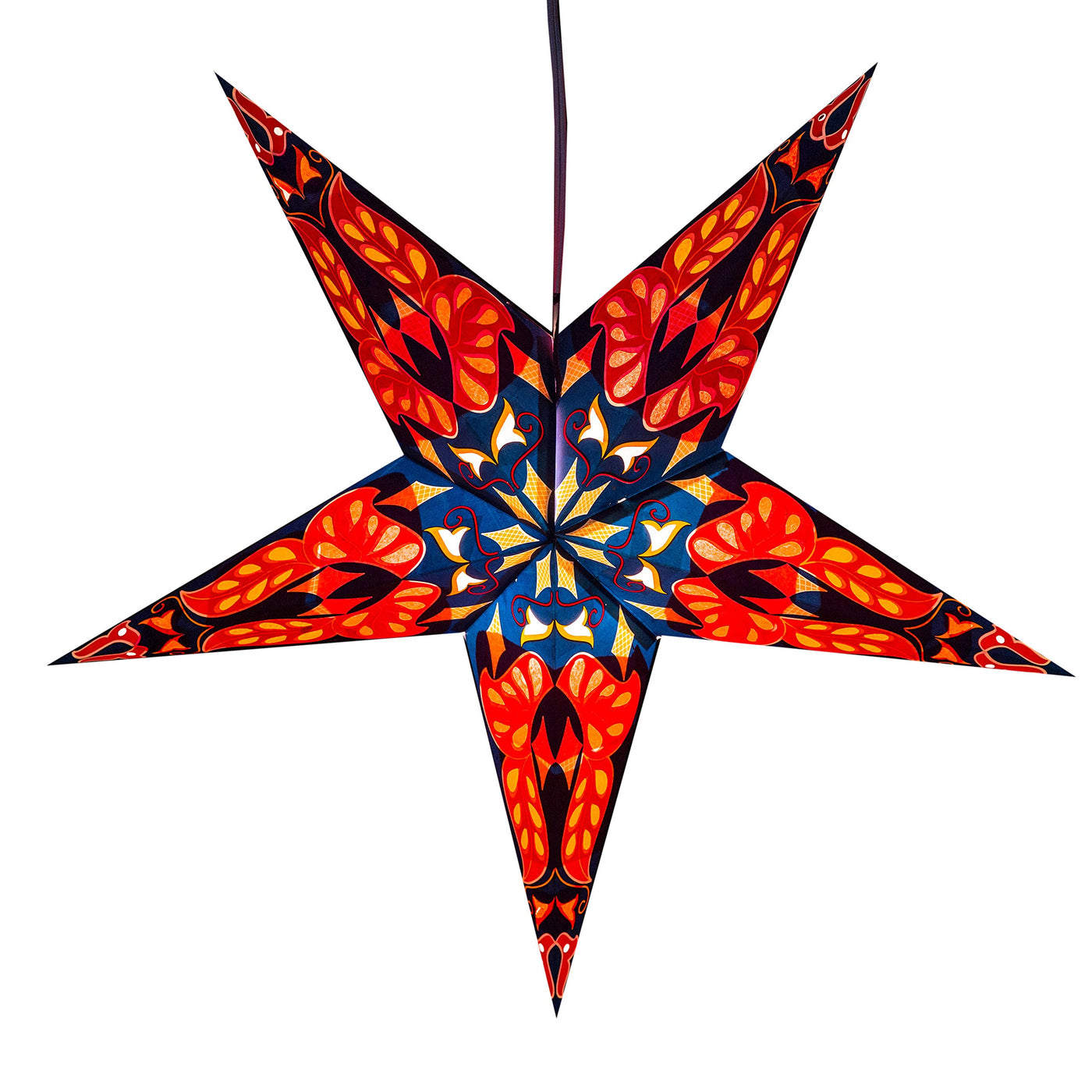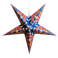 Take the stars from the night sky into your home! Add unique illumination with our decorative paper star lights. We have over 70 styles of paper star lamps perfect for any occasion including Christmas and Diwali. Suspend a couple of paper star lights from your living room ceiling and admire the glimmer of little lights cast on the walls. Dangle a paper star lantern in your favorite window and it will appear to fall from the sky. Paper lampshades make great home decorations. Specifications This paper star light features a blue background with dark red, white, and yellow accents, that are accompanied by tissue paper cutouts in light red and yellow which creates a stained glass look.White 12 foot standard power cord with on/off switch included Paper star lights are shipped flat with clear instructions for easy assembly The folded paper light expands into a 3 dimensional star Assembled star is 24 inches wide by 10 inches deep All of our paper star lights are handmade in India and are eco-friendly Lights safely accept up to a 40 watt standard light bulb Going green? Substitute an energy saving LED bulb for a standard bulb Over 70 unique styles available Genuine Hometown Evolution, Inc. Product