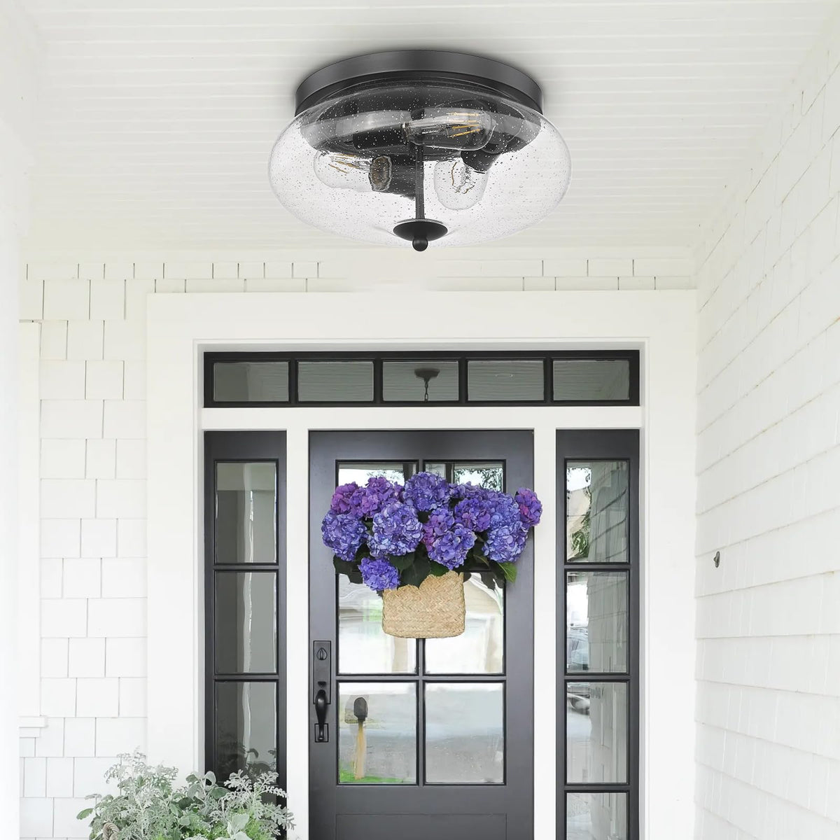 Darkaway Ceiling Light Fixture, 3-Light Flush Mount, Seeded Glass Shade, 13.38in, Black, Model 6T1F, Indoor/Outdoor Use