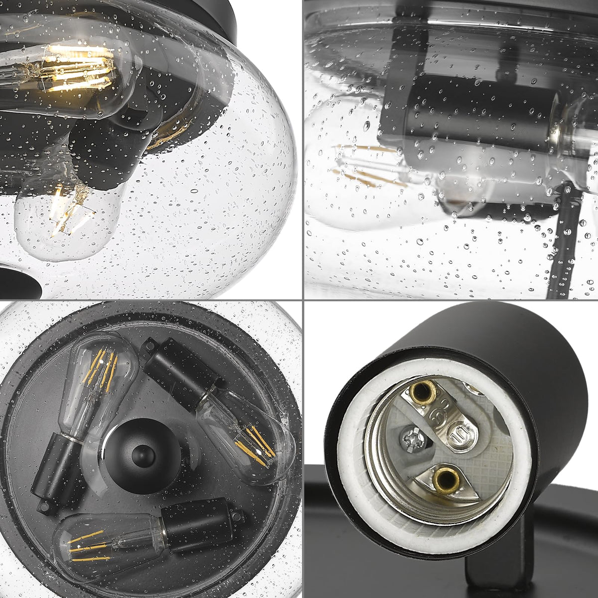 This ceiling light features a round seeded glass shade complemented by a sleek black finish, creating a modern yet rustic look. With three light sockets, it accommodates various bulb types, making it versatile for different lighting needs. The design allows for easy access to the bulbs, simplifying the replacement process and facilitating cleaning. Crafted from corrosion and oxidation-resistant metal, this fixture promises durability and long-lasting performance.