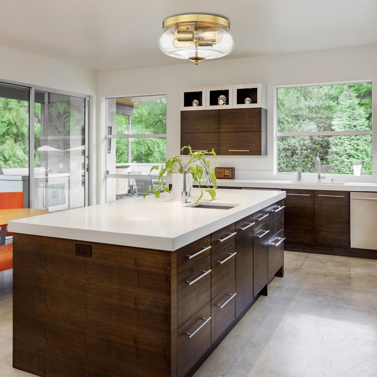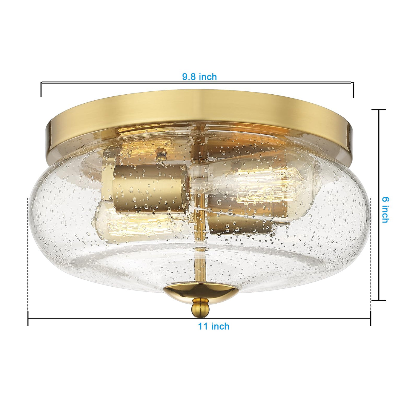 This ceiling light features a round seeded glass lampshade with a gold finish, providing an artistic touch that complements a range of decor styles. The two-light sockets allow for effective light projection, showcasing the beauty of exposed bulbs. The glass shade not only enhances the aesthetic but also makes bulb replacement and cleaning easier.