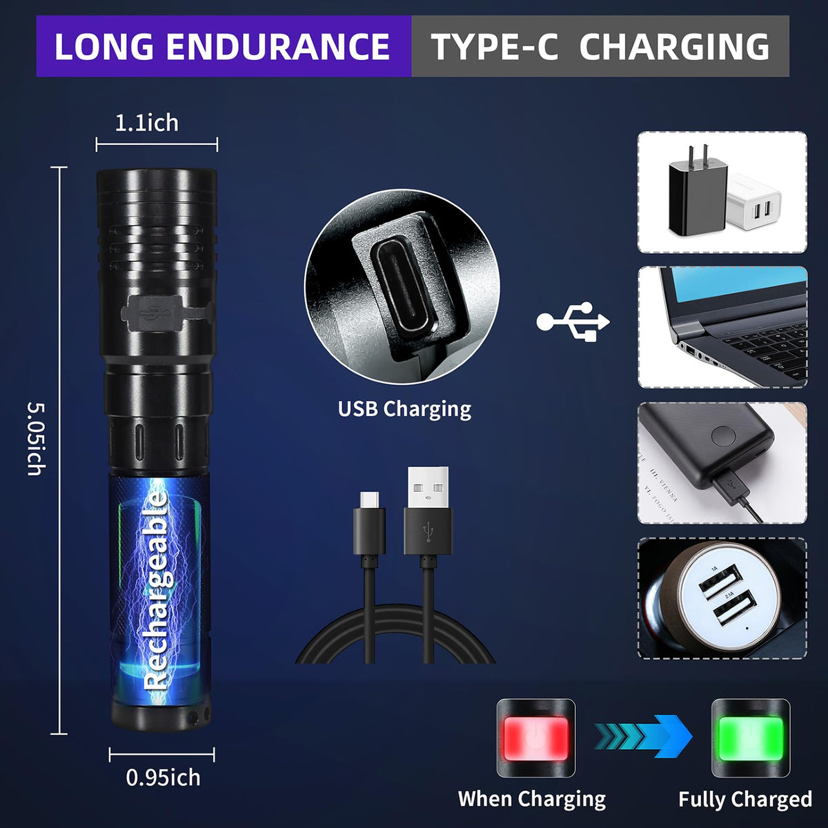 Q: Is the DARKBEAM Flashlight rechargeable, and how do I charge it?A: Yes, the DARKBEAM Flashlight is USB-C rechargeable, which allows for convenient charging anytime and anywhere. It can be charged using a USB adapter (5V/2A), power bank, or other compatible charging devices. The red indicator light will notify you when it's time to recharge.