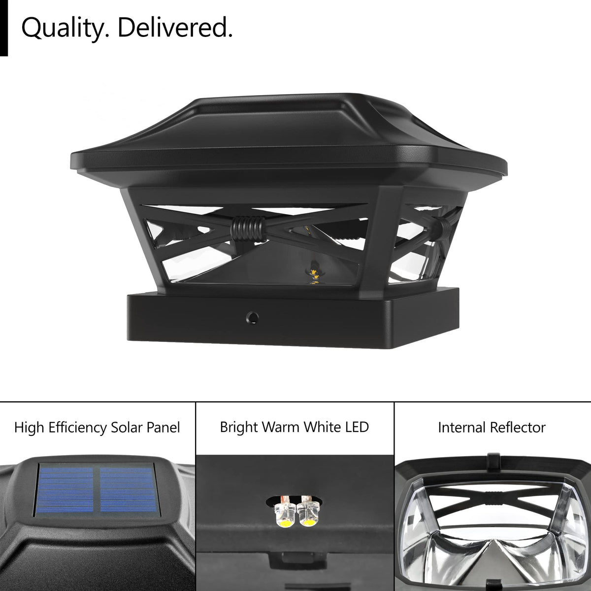 Davinci Lighting Renaissance Solar Post Cap Lights Turn Your Posts Into Outdoor Lights. These Bright And Beautiful Solar Powered Lamps Charge In Sunlight And Turn On Automatically At Night. Versatile: - Fixtures Fit 4 Inch Vinyl Posts, As Well As 4 Inch 5 Inch And 6 Inch Wood Posts. - Can Be Also Set On Any Flat Surface. - Perfect For Fence, Deck, Patio, Path, Dock, Railing, Or Garden Lighting. Cordless: - Place Them Anywhere, Without Worrying About Wires. Easy To Install: - Avoid The Cost And Headache Of Hiring An Electrician Or Contractor. - Simply Screw Onto Your Post. Built To Last: - We'Ve Worked Hard To Build The Best Lights That Deliver Great Value. - Uv Protected Housing And Matte Textured Finish. - Weatherproof For Use In Rain, Sleet, Or Snow. - Lifelong Leds. Specifications: - 25 Lumens Brightness. - Warm White (3000 Kelvin) Led. - 1.2V 800Mah Nimh Aa Size Rechargeable Battery (Replaceable). - Advanced Monocrystalline Solar Panel. - 7-8 Hours Of Battery Life After 8 Hours Of Direct Sunlight. Included Base Sizes: - 4 Inch Vinyl: 4'' X 4'' - 4 Inch Wood: 3.5'' X 3.5'' - 5 Inch Wood: 4.5'' X 4.5'' - 6 Inch Wood: 5.5'' X 5.5''