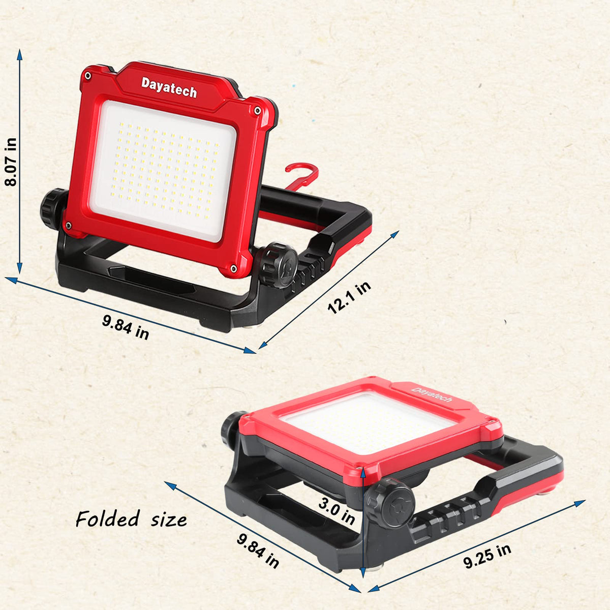 Q: Is the DAYATECH Cordless LED Work Light portable?A: Absolutely! The work light is lightweight and designed for portability. It features a foldable base, magnetic mounting clips, and an integrated hanging hook for versatile use at job sites.