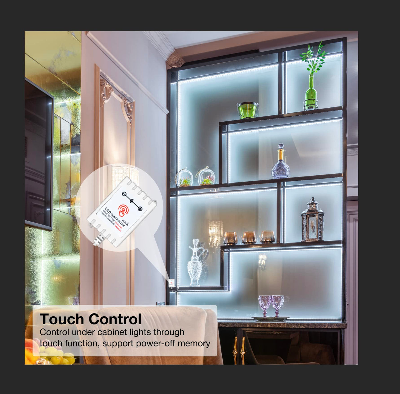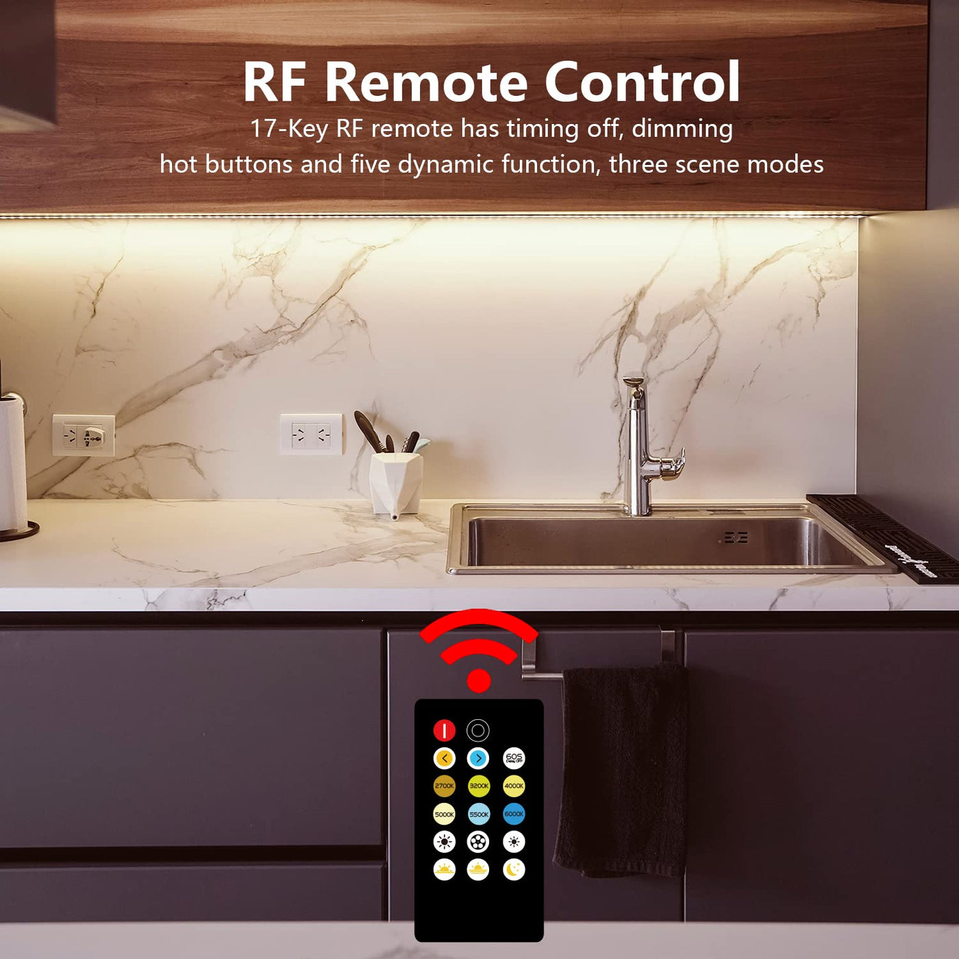 Q: How does the remote control work with the under cabinet lights?A: The kit includes an RF remote that allows you to control the lights from a distance. It has multiple functions, including dimming, timing off, and scene modes. The remote also features a memory function that remembers your last setting, making it convenient for everyday use.