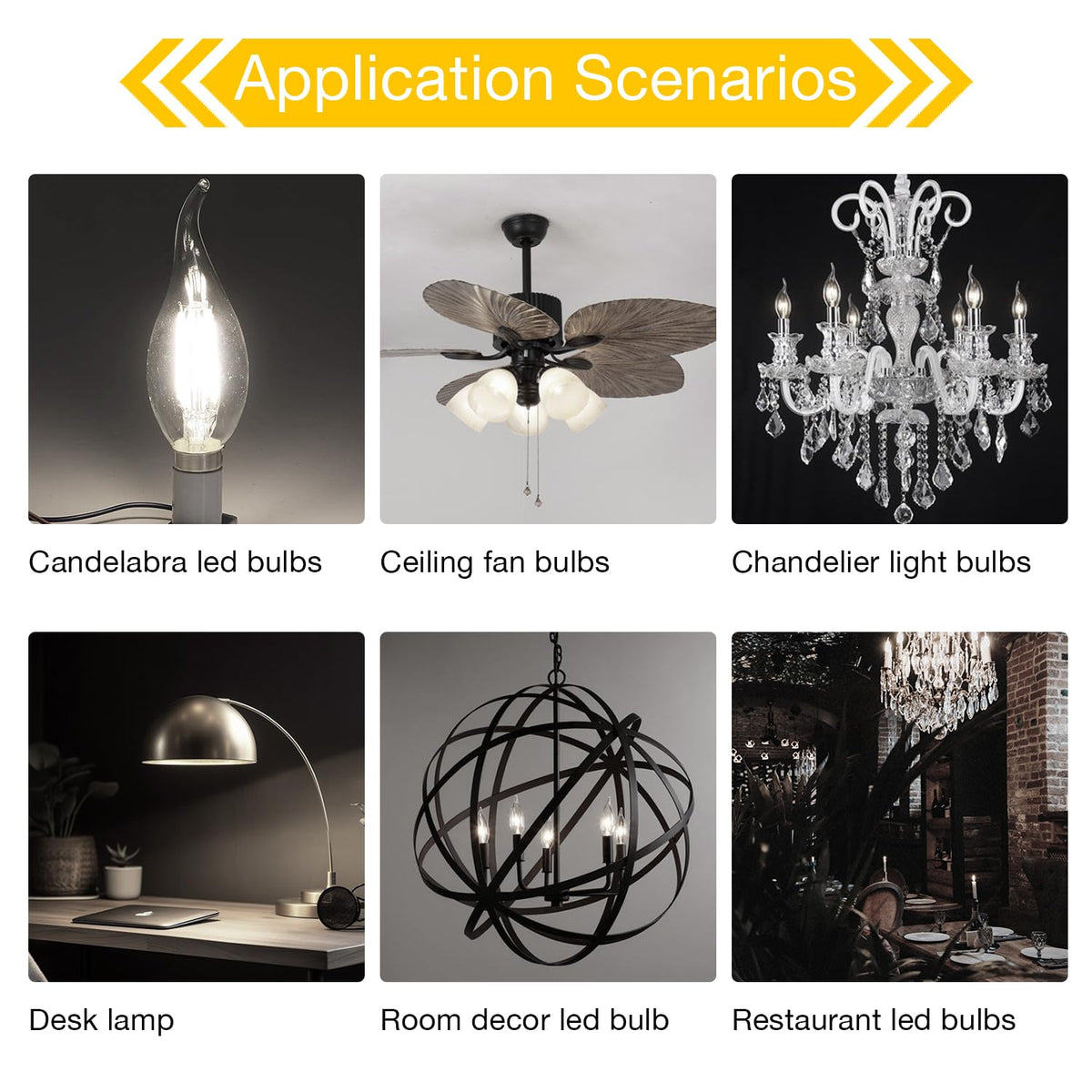 5. With flame tip, clear glass and exposed filament design, our classic candelabra led light bulbs is widely suitable for both decorative or functional use with standard E12 candelabra base, ideal for chandeliers, ceiling fan, wall sconces, pendant light, foyer light, table lamp and other enclosed lighting fixtures.