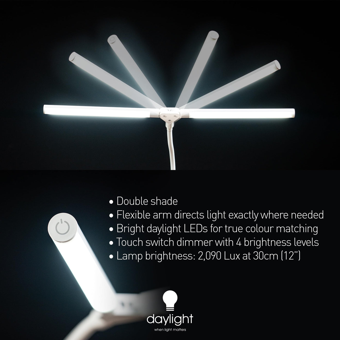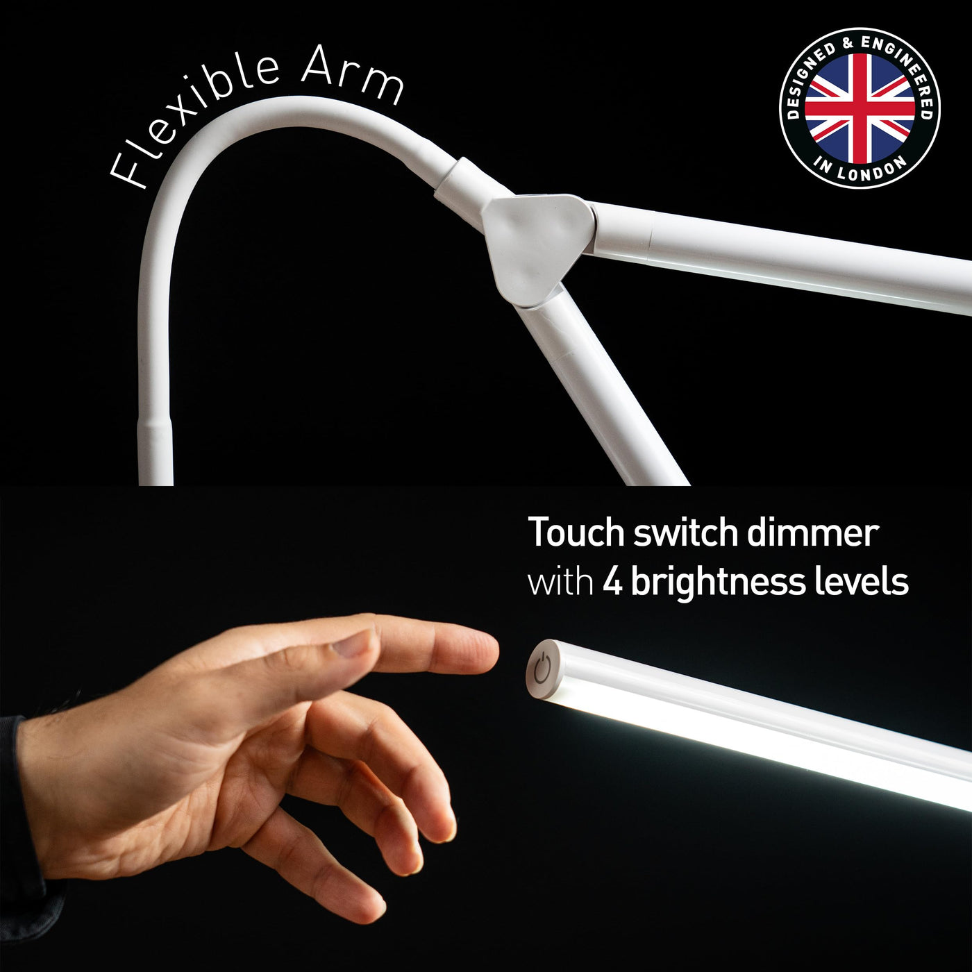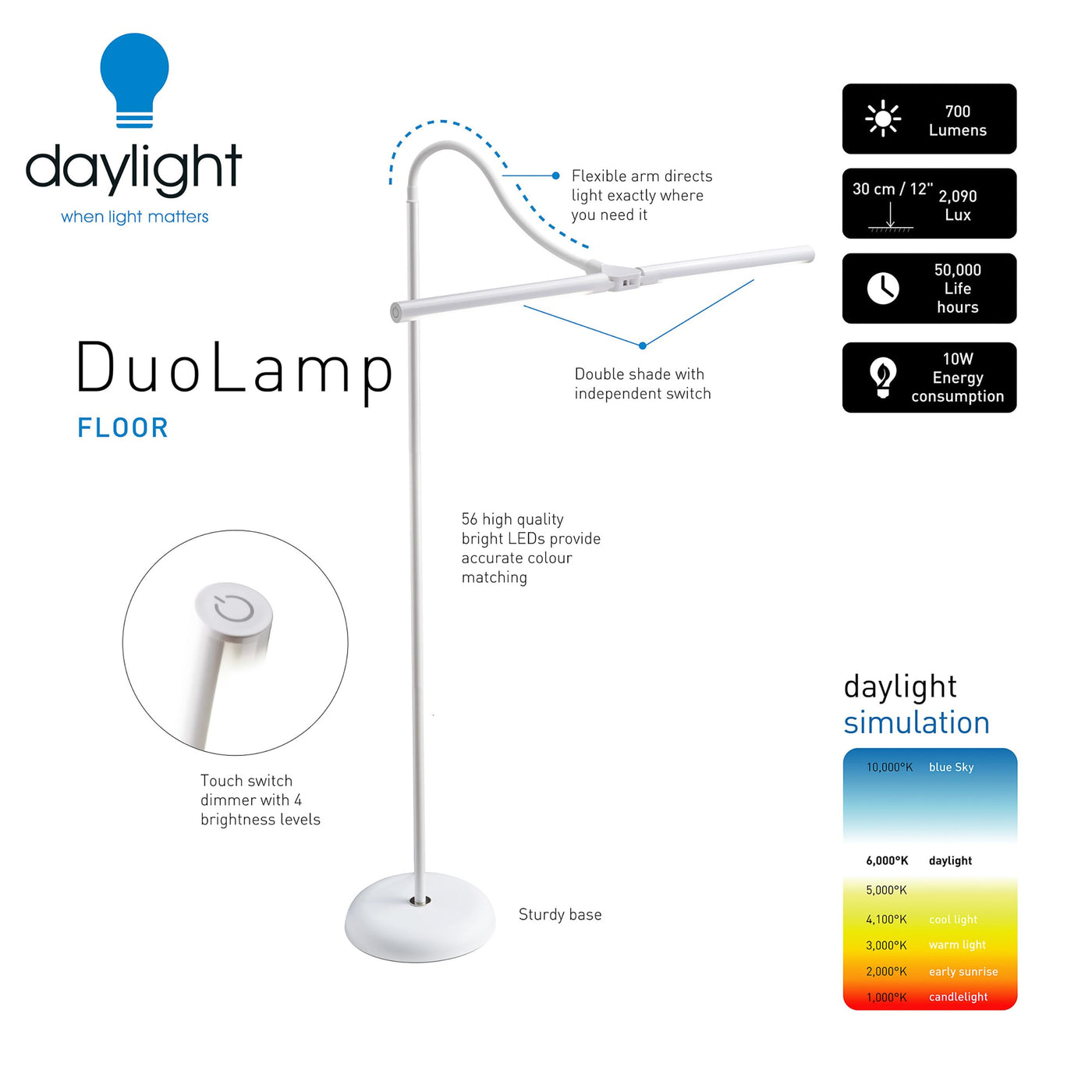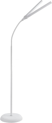 This slim, flexible floor lamp has a modern design and sleek finish. It has two independently adjustable shades allowing high light output over a very wide are or an intense light over a small area. Ideally suited for art, craftwork, health & beauty as well as reading. Light source: LED Lux output at 12": 2, 090 Lux Light colour temperature: 6, 000°K Energy consumption: 10W Product colour: White Product dimensions: 52" x 20. 92 x 8. 3" Maximum Reach: 22. 4" Product Weight: 7. 8Ib Cable length: 68. 9"