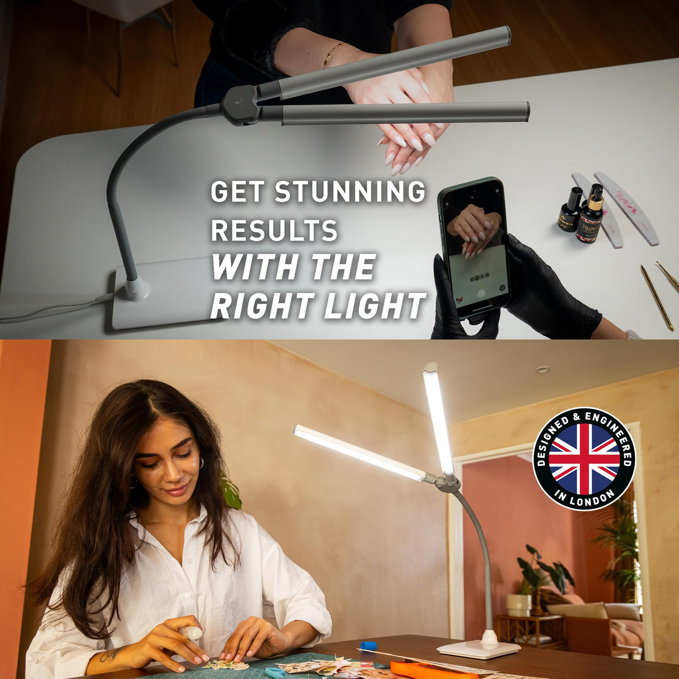 Q: Is the DuoPro™ Table Lamp suitable for sewing and crafting?A: Yes, the DuoPro™ Table Lamp is ideal for sewing and crafting due to its double shade design, which eliminates shadows and provides optimal visibility. The adjustable brightness levels allow you to choose the perfect lighting for detailed tasks, ensuring accuracy and comfort while working on intricate projects.