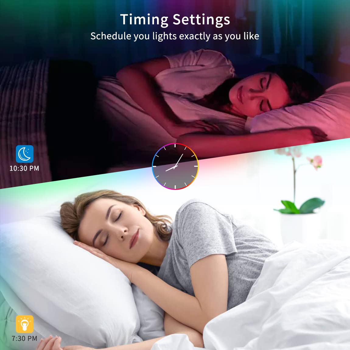 Q: What are the main features of the Daymeet 32.8ft LED strip lights?A: The Daymeet 32.8ft LED strip lights feature music sync capabilities, allowing the lights to change colors with music beats. They also have a timing function for automatic on/off settings, easy control through an app, an IR remote, and a 3-button controller box. Safety is ensured with a 12V working voltage and short circuit protection.
