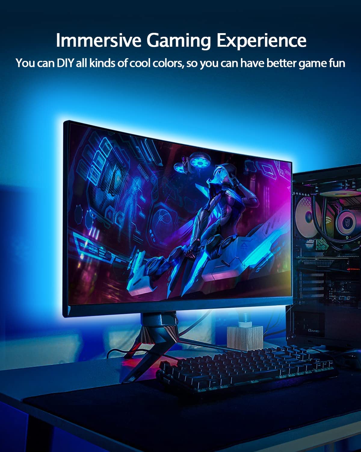 Q: How do the music sync features work with the LED TV lights?A: The LED lights come with a built-in microphone that can sync with music or voice. By activating the microphone mode through the Bluetooth app, the colors of the lights will change in harmony with the beat of your music or voice.