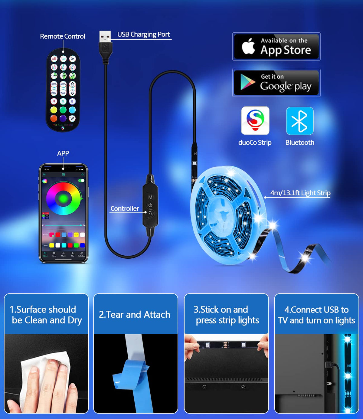 Daymeet 13.1ft RGB LED TV Backlight, Music Sync Bluetooth Control, USB Powered Light Strip for 45-60 inch TVs, Solid Colors