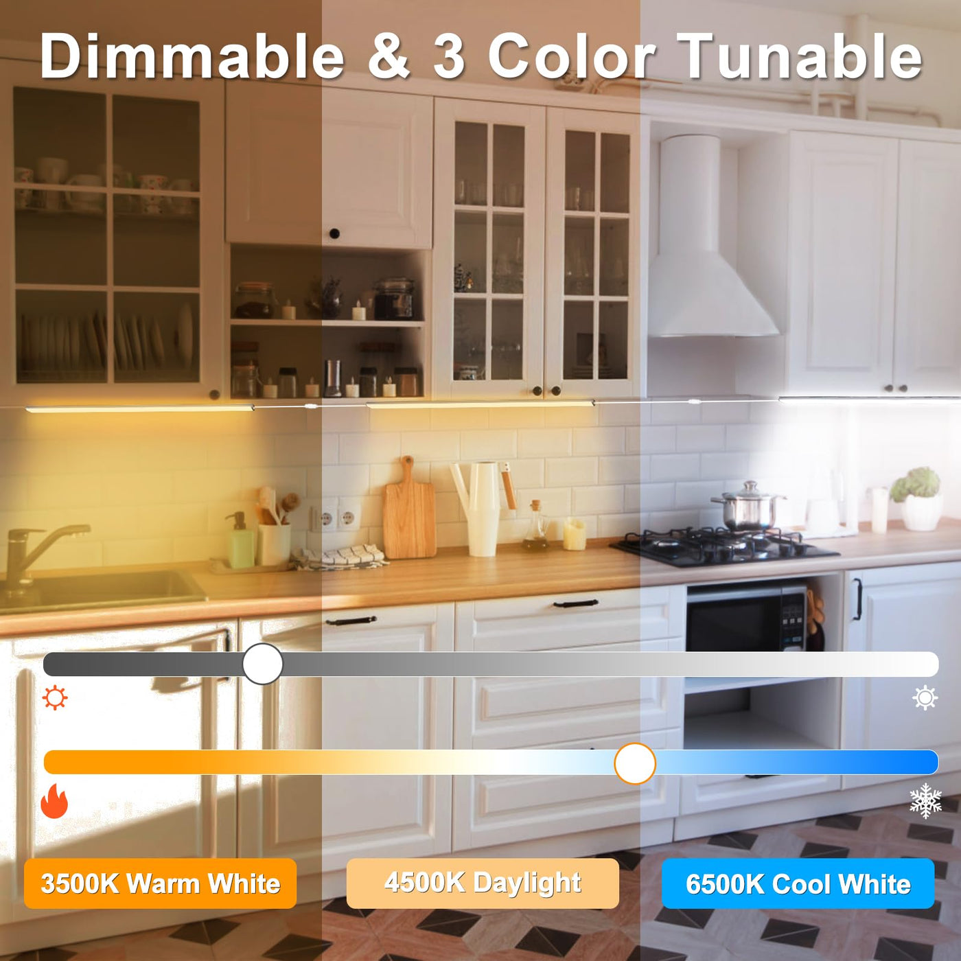 Q: What are the key features of the Daymeet Under Cabinet Lights?A: The Daymeet Under Cabinet Lights offer super bright illumination with 1300 lumens from 34 LED beads per light bar. They feature three color temperatures (3500K, 4500K, 6500K) and brightness adjustment from 0% to 100%. Additionally, they are ultra-thin at 0.25 inches, making them easy to conceal under cabinets.