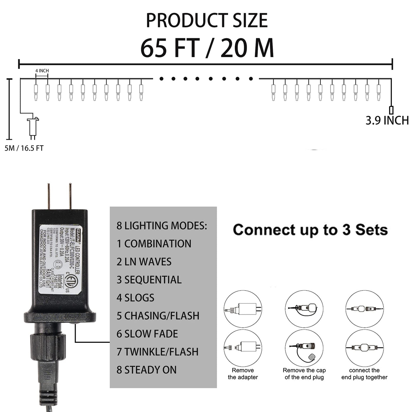 Q: Can I connect multiple strings of lights together?A: Yes, you can connect up to three light strings together, as long as the total does not exceed one thousand LED lights.