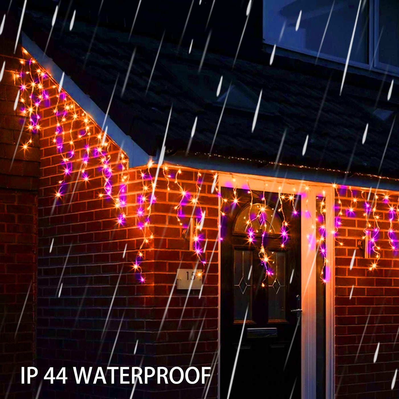 Dazzle Bright 360 LED Halloween Icicle Lights Outdoor, Light Up Halloween Decorations 8 Modes Fairy Lights for Outside Patio Garden Holiday Party (Orange & Purple)
