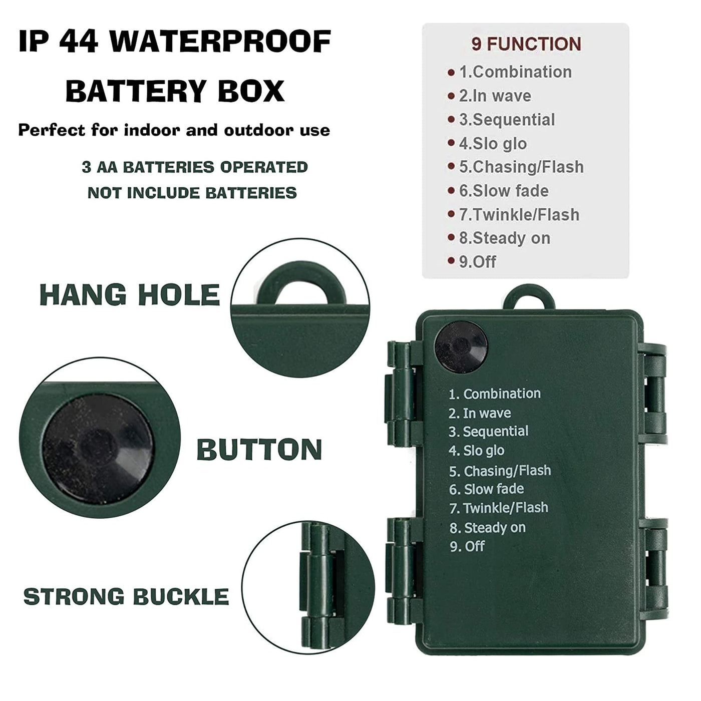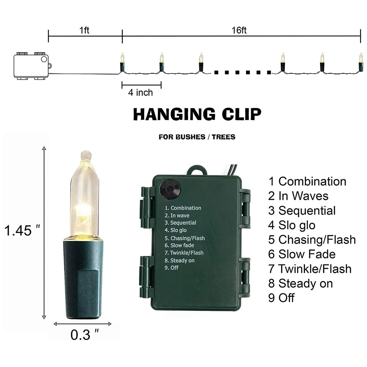 Q: What lighting modes are available with these fairy lights?A: These mini string lights feature 8 different lighting modes, including combination, in wave, sequential, slo glo, chasing/flash, slow fade, twinkle/flash, and steady on.