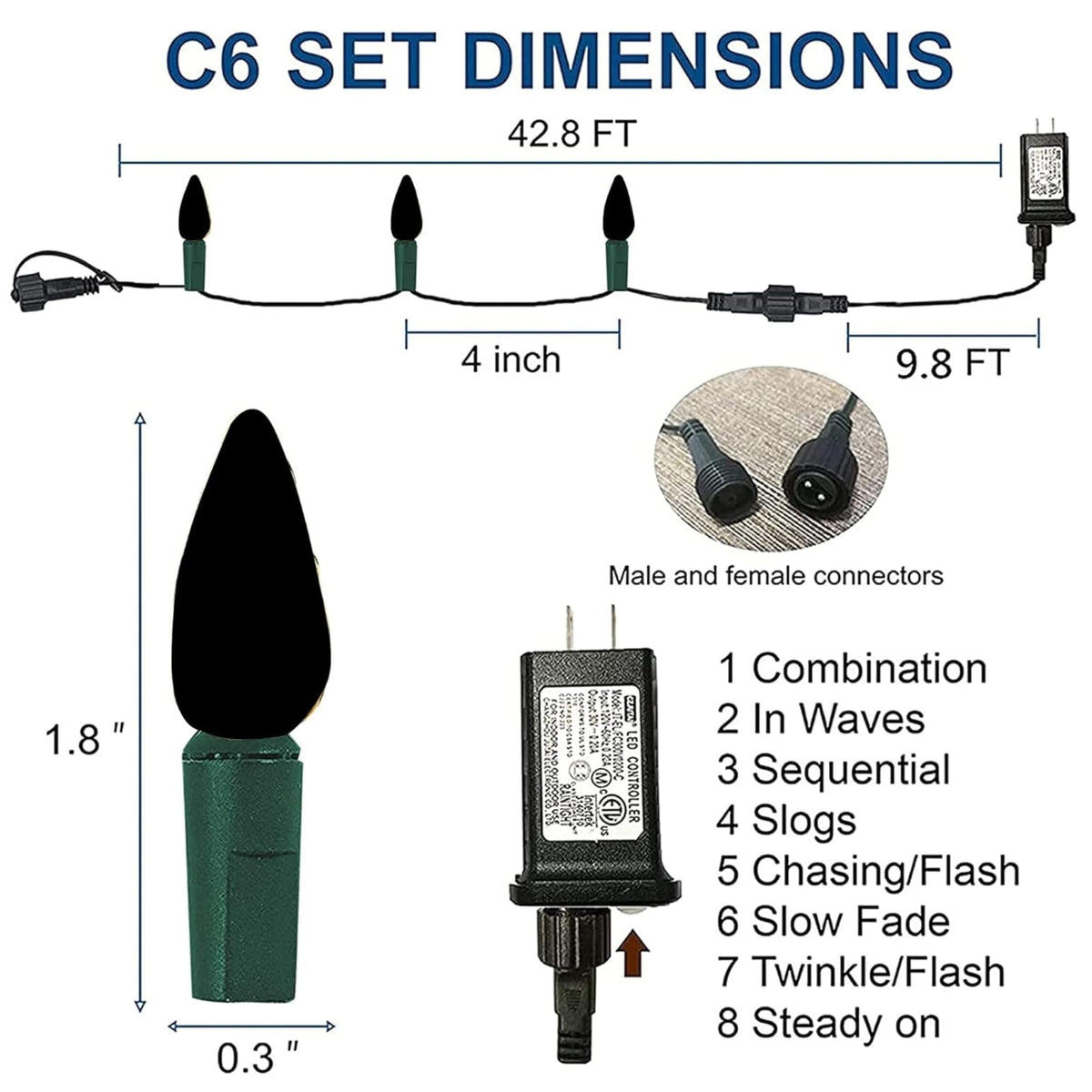 Q: How long are the Dazzle Bright C6 Christmas String Lights?A: The Dazzle Bright C6 Christmas String Lights are a total of 42.8 feet long, with the actual wire containing LED bulbs measuring 33 feet and a 9.8-foot lead wire without lights.