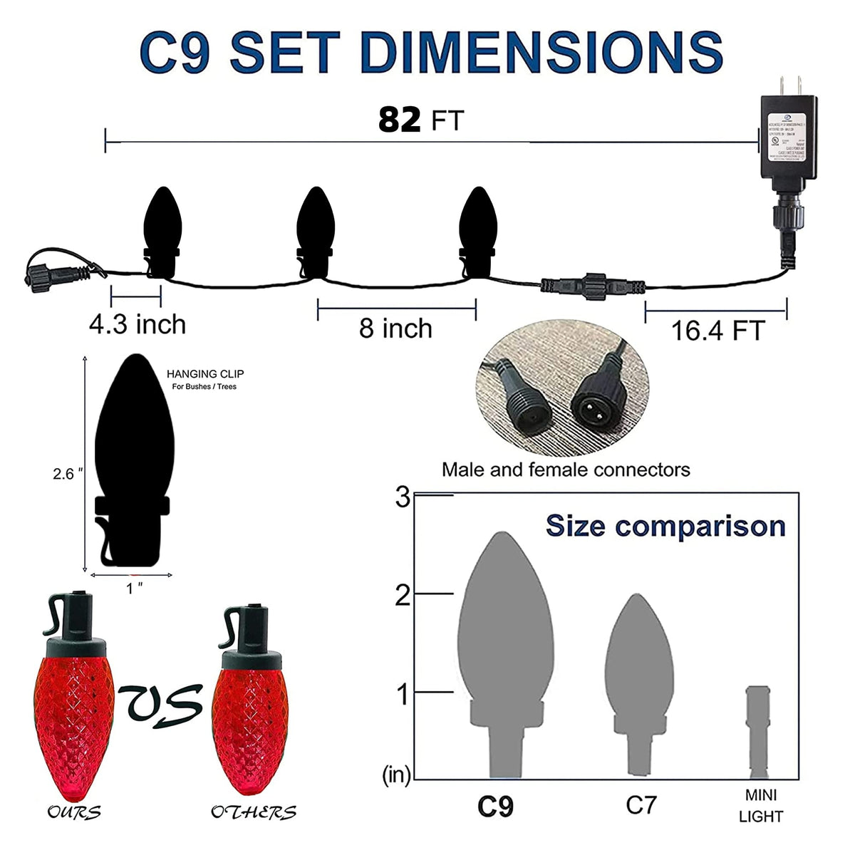 Q: What are the specifications of the Dazzle Bright C9 Christmas String Lights?A: The Dazzle Bright C9 Christmas String Lights feature 100 LED bulbs, with a total length of 82.5 ft (66 ft of lights and 16.4 ft of lead wire). The spacing between each LED bulb is 8 inches, and they operate on a low voltage of 29V for safety.