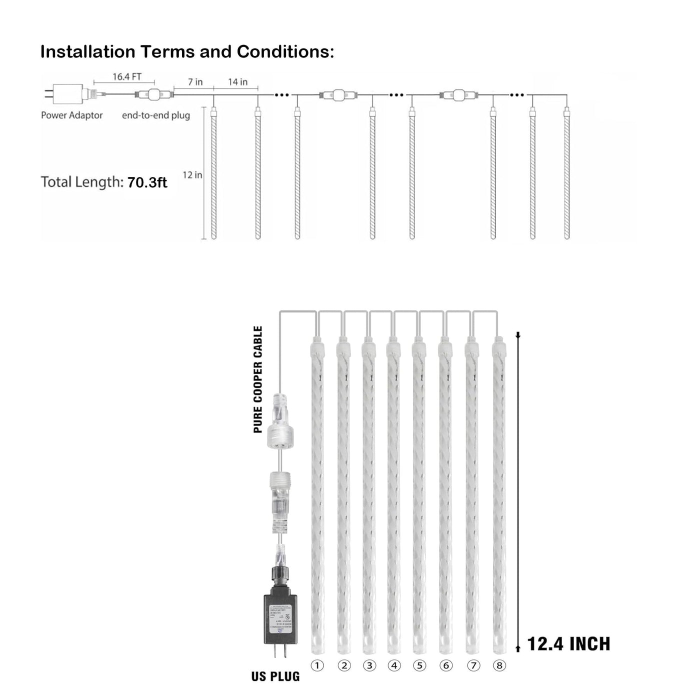 This product features 48 individual tubes, each measuring 30 cm (12 inches) in length. Each tube is equipped with 36 bright LEDs, allowing for a stunning visual display. The lights are crafted from well-made clear Polyvinyl Chloride (PVC) material, ensuring durability and longevity. The string wire connecting each tube measures 14 inches, and a generous 16.4 FT lead wire allows for easy power connection, making installation convenient and hassle-free.