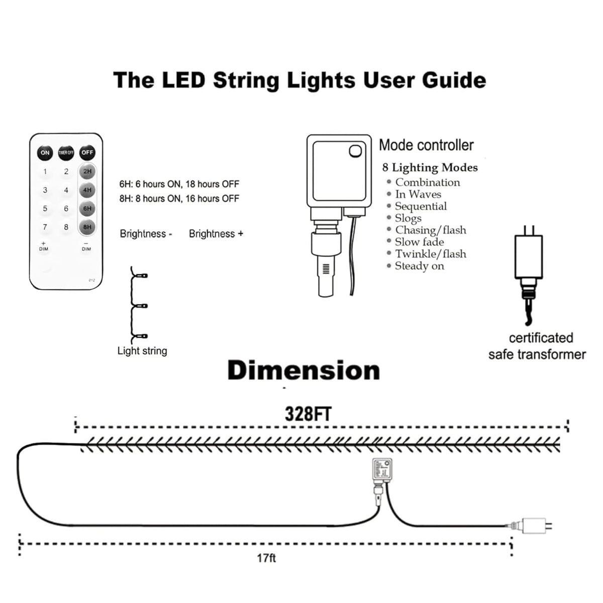 Q: What are the key features of the Dazzle Bright Outdoor Christmas String Lights?A: The Dazzle Bright Outdoor Christmas String Lights feature 1000 LED bulbs on a 328 ft wire, a 17 ft lead cord, 8 different lighting modes, a remote control for easy operation, and a waterproof design suitable for both indoor and outdoor use.