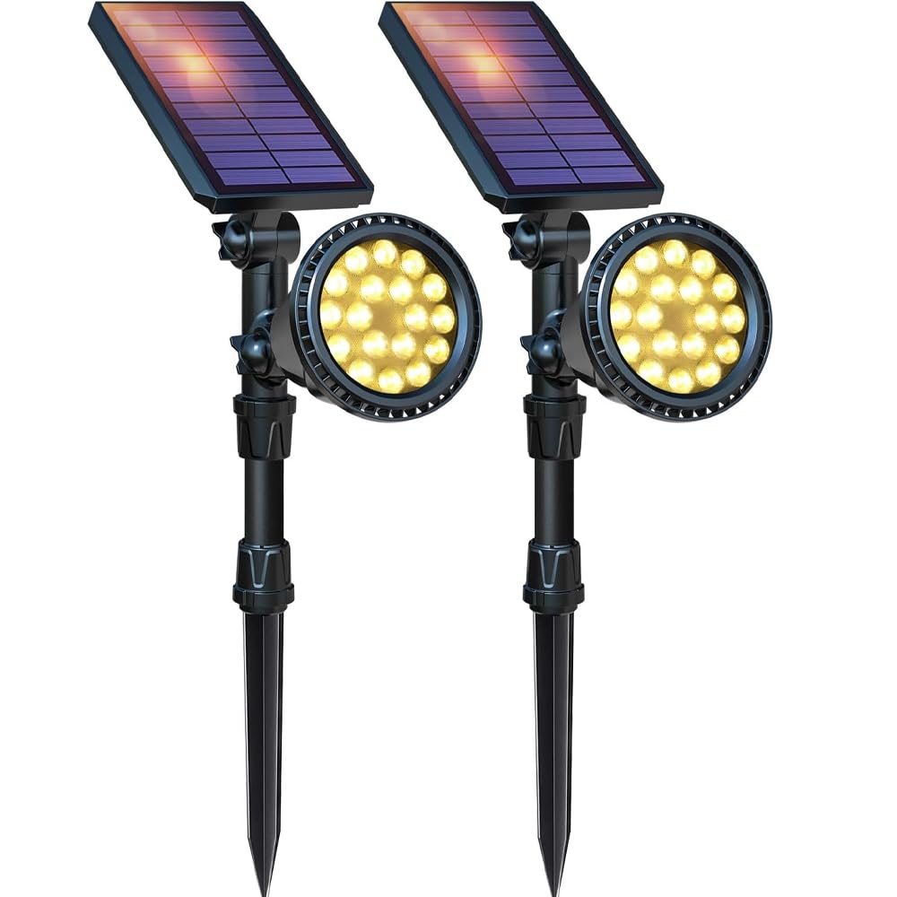Super Bright Performance: Equipped with 18 premium LED chips, these solar spotlights deliver an impressive 600 lumens of warm white light, illuminating your outdoor spaces up to 33 feet away.