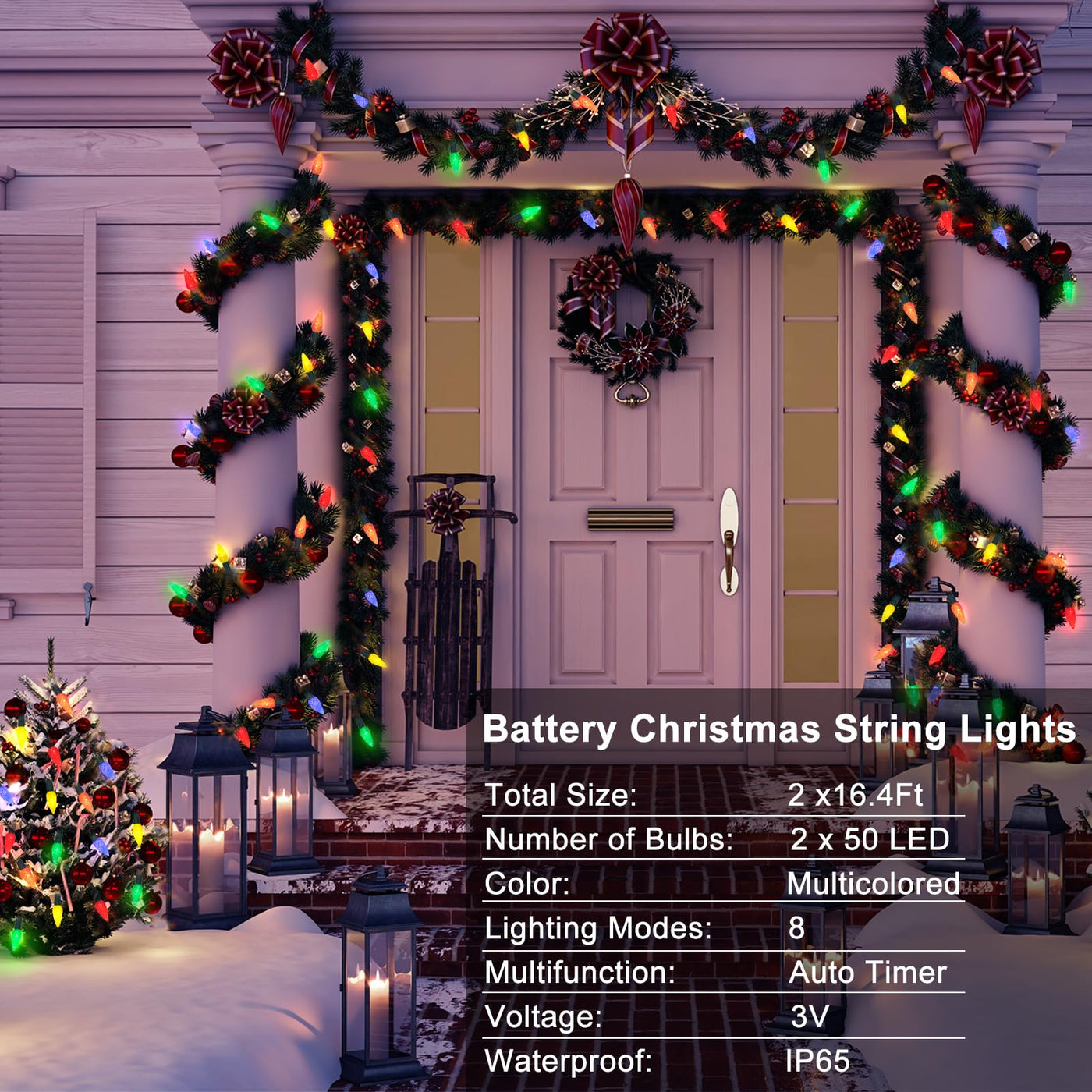 Q: What types of lighting modes are available with these string lights?A: These multicolor battery-operated string lights offer 8 different lighting modes, including combination, in wave, sequential, slo glo, chasing/flash, slow fade, twinkle/flash, and steady on, allowing for versatile decoration options.
