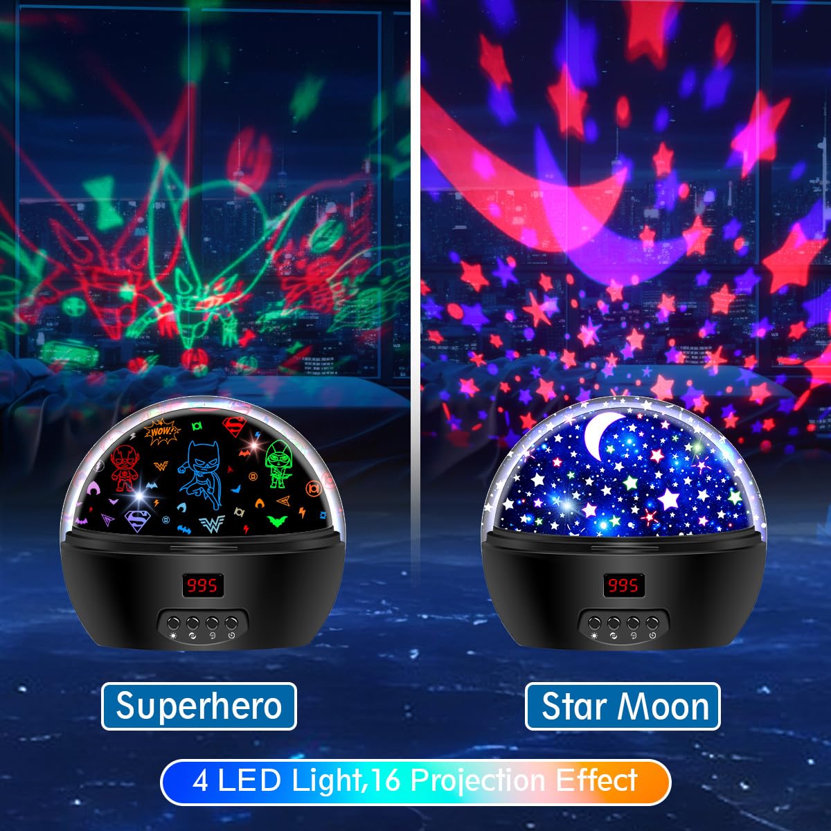 DCAUT Upgraded Star Projector Night Light The star lamp adopts the shape design of dinosaur eggs, which attract the babys eyes and increase its interest. The higher bright led beads that can see the clear pattern, clearer and brighter, 360-degree rotating projection lamp rotates silently and combines 17 color modes including warm white, blue, red, and green, you can choose a single color or multiple colors to create a vivid & colorful fantasy atmosphere on the wall and ceiling Fetures: LED digital display& Timer: The moon lamps with LED digital display that wont hurt your eyes in the dark, we can set the timer for 5-995 minutes, and it will automatically turn off when the time ends Two Theme Films: (Starry sky) Dots of stars are like pearls. Inlaid under the night, shining brightly. (Leaves) The birds in the woods began to become active and chirping cheerfully Multifunctional: The outer dome is designed frosted texture that is soft its light resource. The package comes with a string, easy to carry it anywhere, which regard as a night light, camp light, diaper light, and so on Best gift for birthday and festival: The starry night light projector for Baby can decorate the babys room, nursery, and bedroom decoration. It can accompany the boys and girls in growing up to overcome the scare of darkness, best gifts to the 2 3 4 5 6 7 8 9 10 11 12 year old kids Warning: Please do NOT use the USB cable and the batteries at the same time. The batteries need to be taken out from the night light when not in use Package including: 1* Star night light 1* USB cable 1* String 1* User Manual