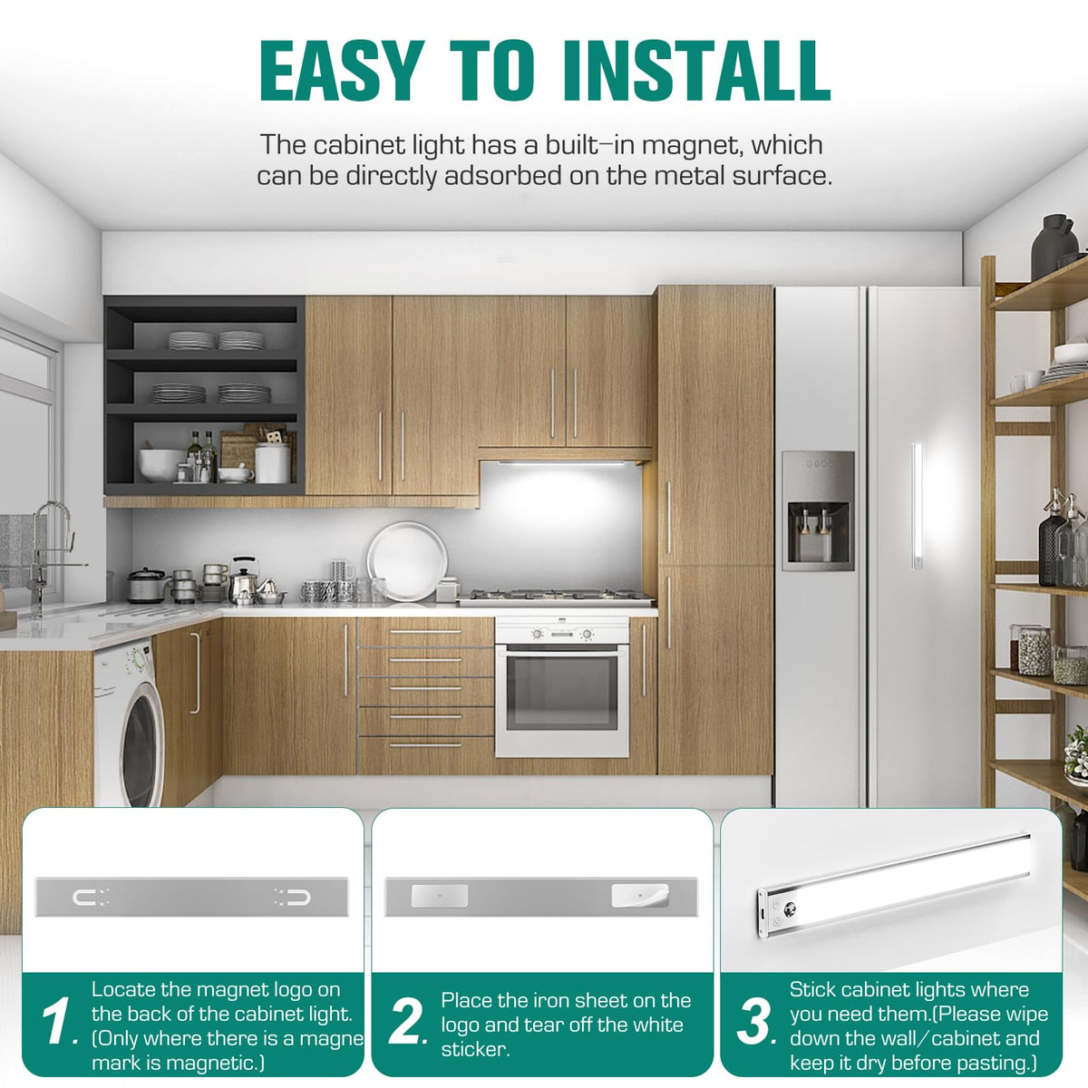 Q: Is installation easy for these under cabinet lights?A: Yes, the installation is straightforward. The lights are only 9mm thick, making them ultra-thin and versatile for tight spaces. They come with built-in magnets, allowing them to stick to any iron surface, or you can use the included iron sheets with tape for non-iron surfaces. This makes it easy to remove and reposition the lights as needed.