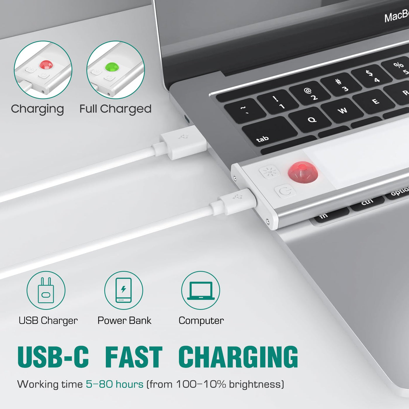 - **USB-C Rechargeable with Long Battery Life**: Equipped with a built-in 1000mAh rechargeable battery, these LED lights can be charged via USB-C on any compatible device, including computers and power banks. A quick 3-4 hour charge provides up to 80 hours of continuous light on Always-on Mode or 7-25 days in Motion Sensor Mode, depending on usage.
