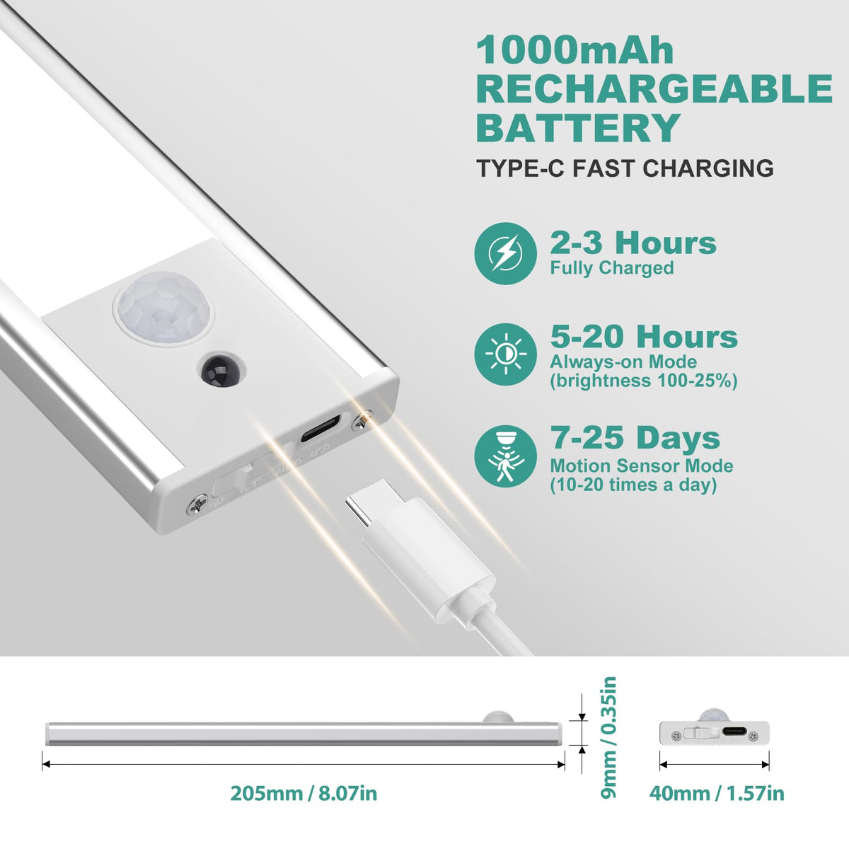 - **USB-C Rechargeable & Energy Efficient**: Featuring a built-in 1000mAh rechargeable battery, these battery-operated lights can be charged using any standard USB-C outlet, including computers and power banks. Enjoy up to 80 hours of illumination on Always-on Mode or 25 days in Motion Sensor Mode, making these lights a sustainable choice for your home.