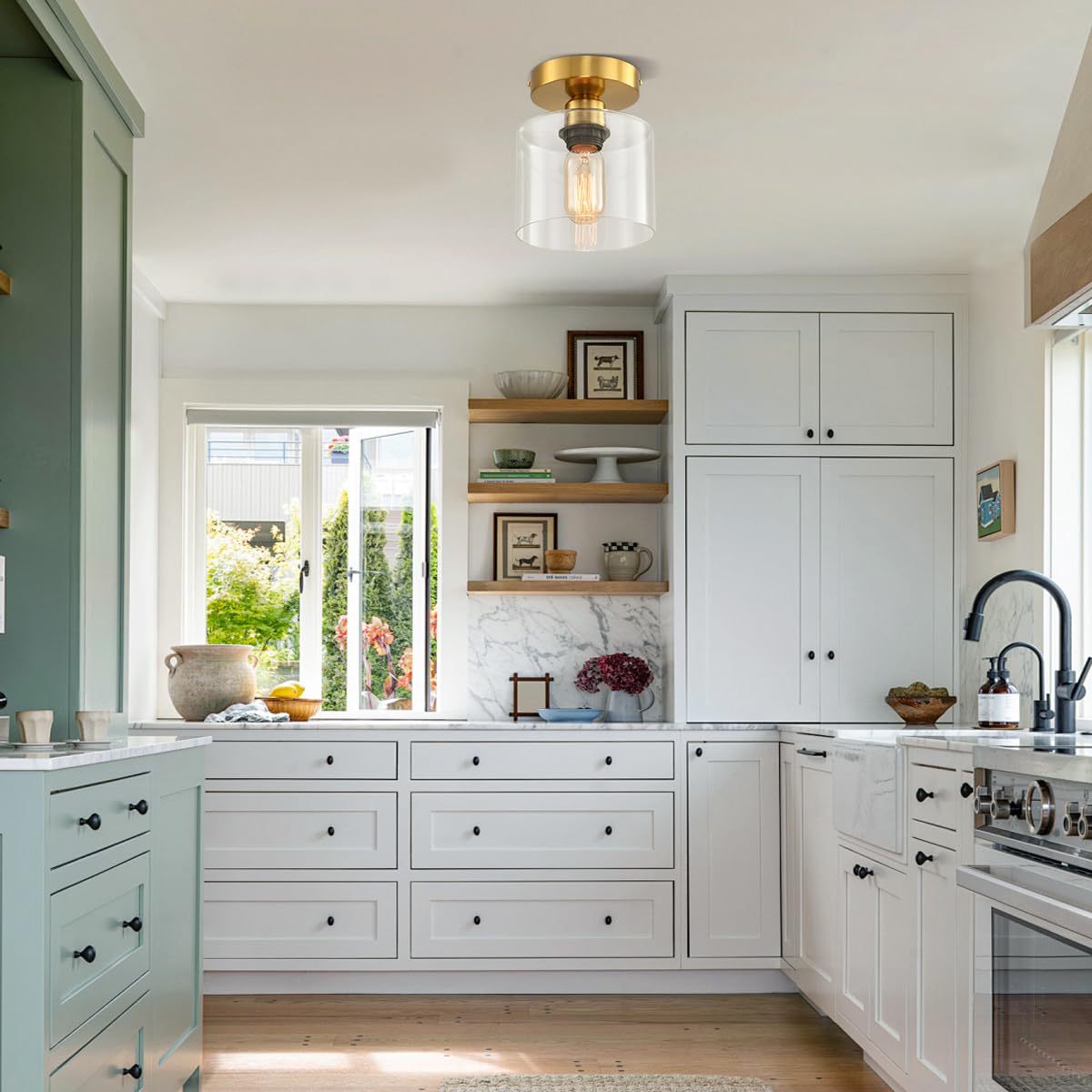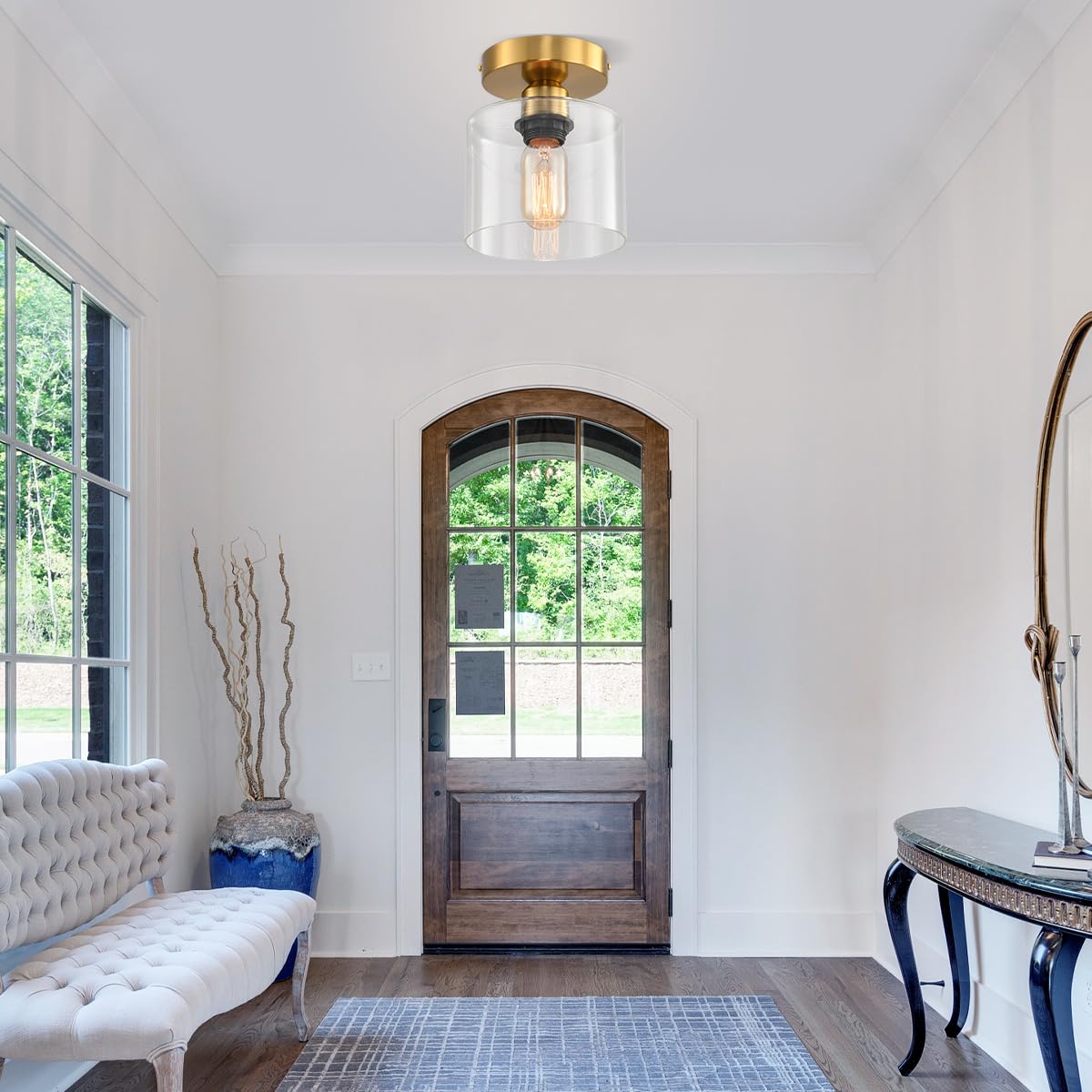 Q: What style does the Deamakk Brass Modern Semi Flush Mount Ceiling Light embody?A: This ceiling light fixture embodies a modern industrial style, characterized by its simple design and combination of brass and clear glass materials, making it suitable for a variety of interior design themes.