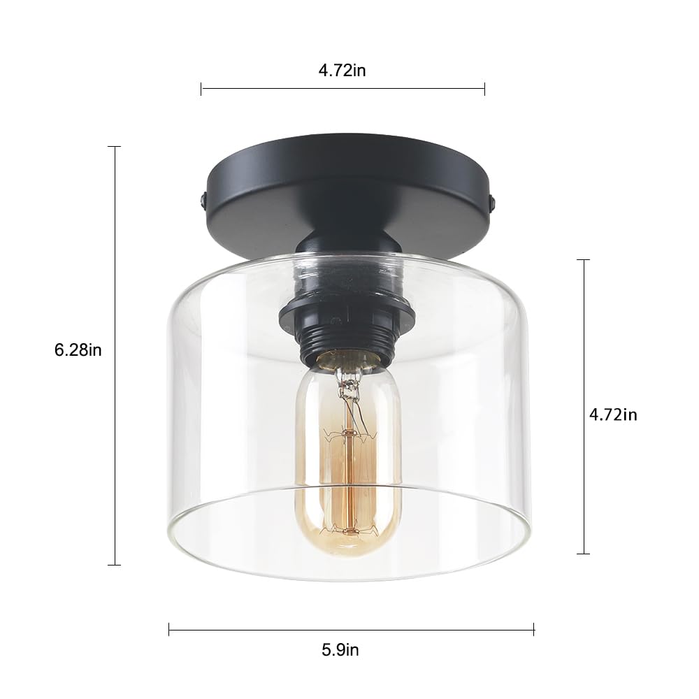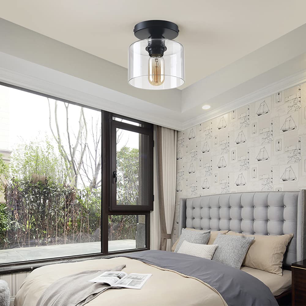 Q: What design style does this ceiling light fixture complement?A: The Deamakk Modern Semi-Flush Mount Ceiling Light features a matte black finish and a clear glass shade, embodying a simple yet modern industrial design. It complements various decor styles, especially those with rustic or farmhouse themes.