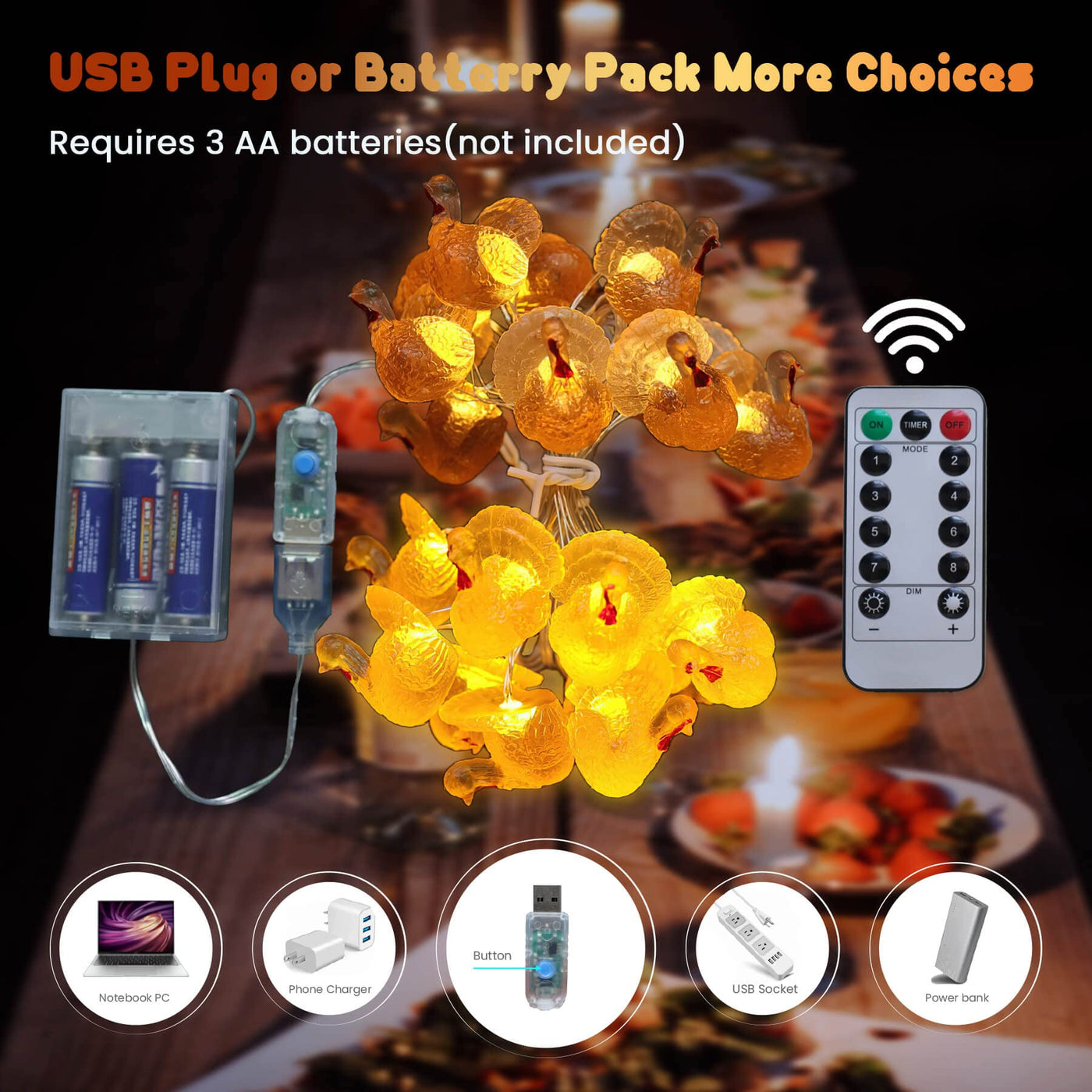 Q: What are the power options for the Decorative Fairy Mini Turkey String Lights?A: The Decorative Fairy Mini Turkey String Lights offer two power options: you can use a USB plug for a constant power source or operate them with 3 AA batteries for portability, making them versatile for various settings.