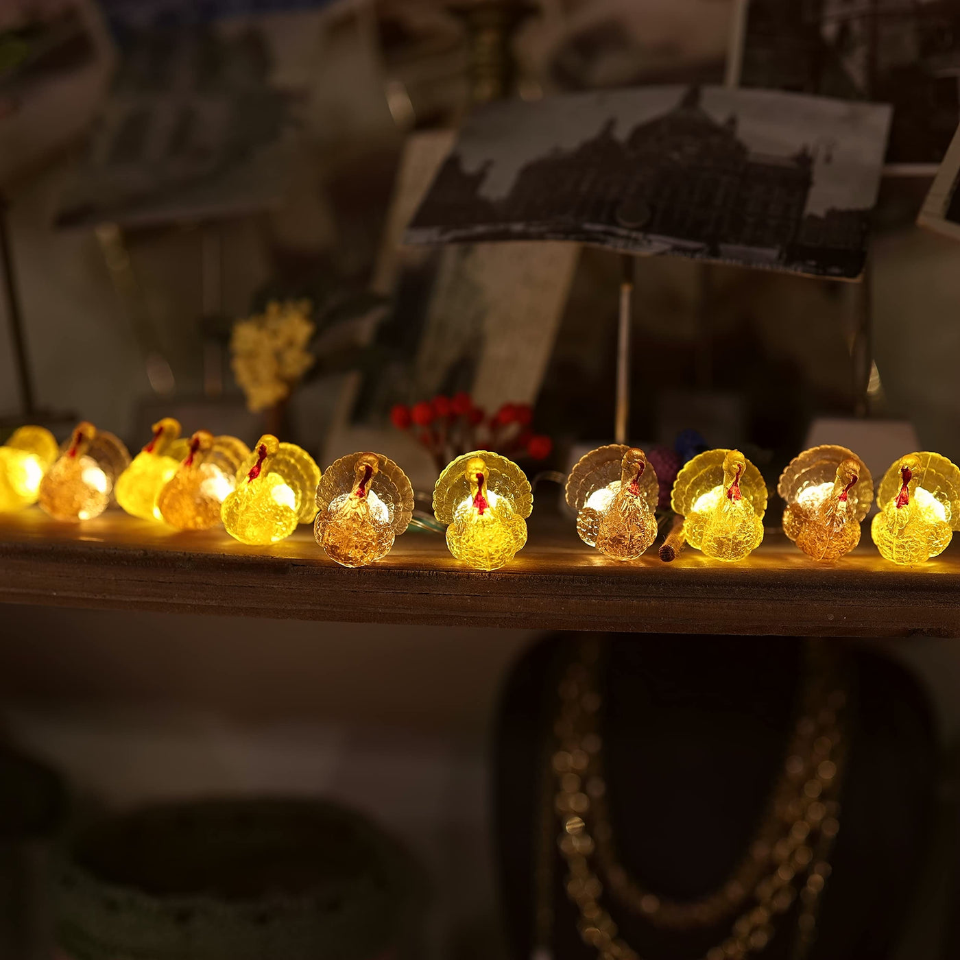 Q: How long is the Decorative Fairy Mini Turkey String Lights?A: The string lights measure 8 feet in length, providing ample coverage for decorating tables, mantels, or garlands during Thanksgiving and fall festivities.