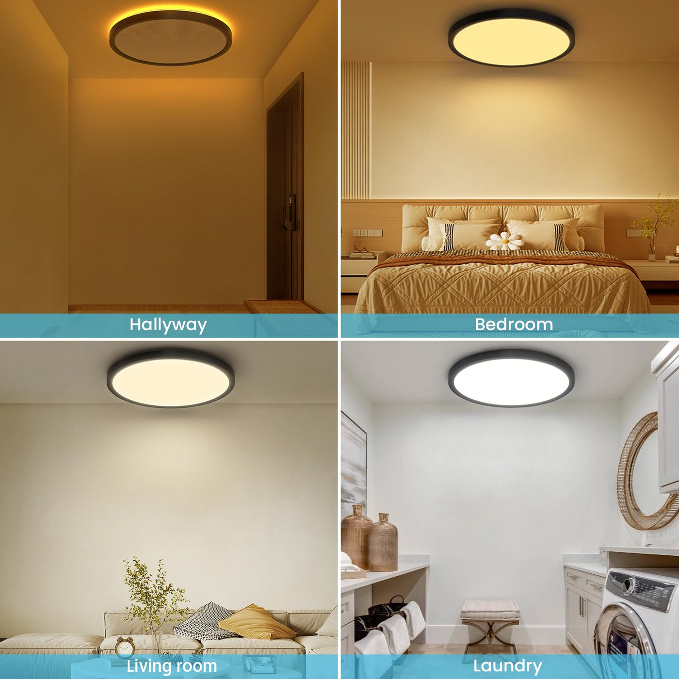Q: Can I adjust the color temperature and brightness of the ceiling light?A: Yes, this ceiling light offers three adjustable color temperatures: 2700K (warm white), 4000K (natural white), and 6500K (cool white). Each color temperature also features stepless dimming from 10% to 100% brightness, allowing you to customize the ambiance according to your needs.