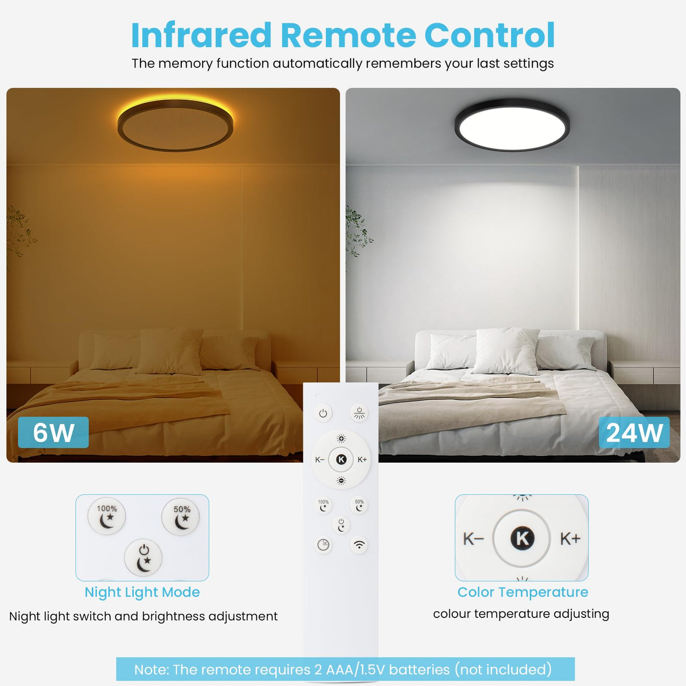 Deeplite 12In Led Flush Mount Ceiling Light Fixture With Remote Control, Led Flush Mount Ceiling Light Fixture With Remote Control, Deeplite 12Inch 24W 1800K-6500K Dimmable Light Colors Stepless Dimming, Modern Thiner Low Profile Ceiling Night Lights For Bedroom Kitchen.