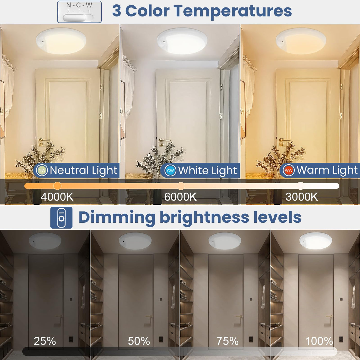 Q: What are the main features of the DEEPLITE Wireless Ceiling Lights?A: The DEEPLITE Wireless Ceiling Lights feature a motion sensor that activates the light from approximately eighteen feet away, a remote control for adjusting brightness and setting timers, three color temperature options (warm white, cool white, and natural white), and a rechargeable battery with a lifespan of up to fifty thousand hours.