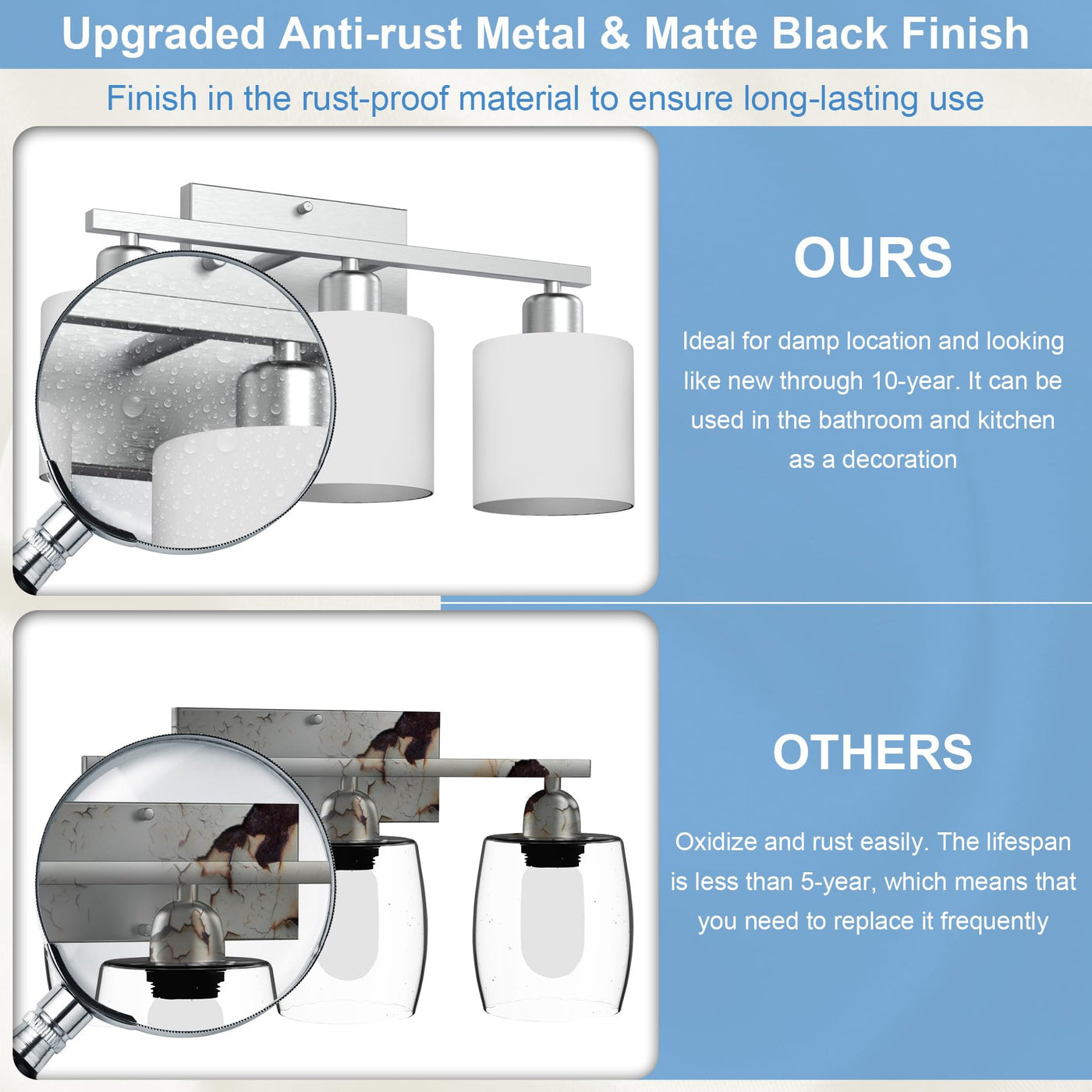 Specification:Bathroom Light Fixtures Over MirrorVoltage: 120VMax watt: 60wattMaterial: brushed nickeland GlassBase: E26 Medium BaseSize: 18.11x5.90x9.05inchesWeight:40.5ozStyle: Modern/Classic/ MinimalistWhat? in the Box?1XBathroom Vanity Light Fixture2XWhite Glass Lampshades2XSocket Rings1XMounting Plate2XE26 Standard Socket2XScrew Nuts Screw3XWire Nuts1XUser ManualBathroom Light with Anti-rust Brushed NickelVanity light fixtures with E26 Standard SocketsBathroom vanity light that work well with most dimmersEasy to installthe bathroom lights over mirrorVanity lights for bathroom, mirror.3-Light Wall Sconces Lighting for bedroom, living room.Warm Tips:1. Please cut off the power supply before installation for your safety.2. Please kindly note that there may have a ?0.5in error as the size is measured by hand.