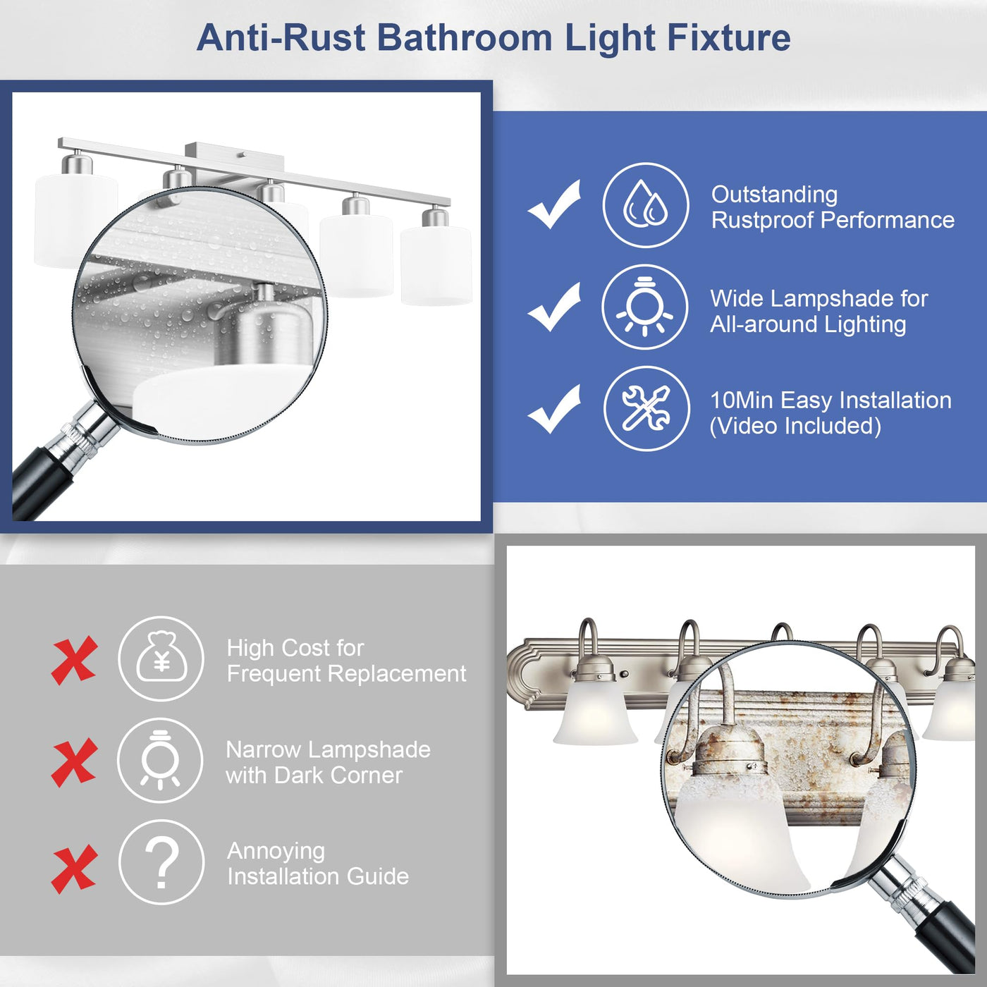 Specification:Bathroom Lights Over MirrorVoltage: 120VMax watt: 60wattMaterial: brushed nickeland GlassBase: E26 Medium BaseSize: 28.34*6.29*9.05inchesStyle: Modern/Classic/ MinimalistWhat? in the Box?1XBathroom Vanity Light Fixture5XWhite Glass Lampshades5XSocket Rings1XMounting Plate5XE26 Standard Socket2XScrew Nuts Screw3XWire Nuts1XUser ManualBathroom Light with Anti-rust Brushed NickelVanity light fixtures with E26 Standard SocketsBathroom vanity light that work well with most dimmersEasy to installthe bathroom lights over mirrorVanity lights for bathroom, mirror.5-Light Wall Sconces Lighting for bedroom, living room.Warm Tips:1. Please cut off the power supply before installation for your safety.2. Please kindly note that there may have a ?0.5in error as the size is measured by hand.