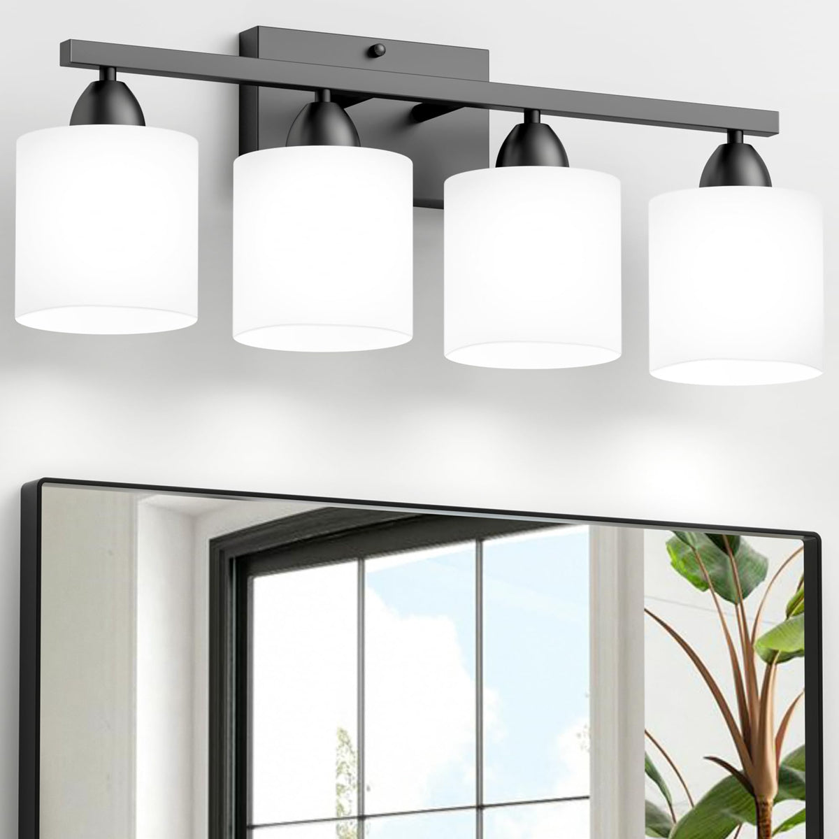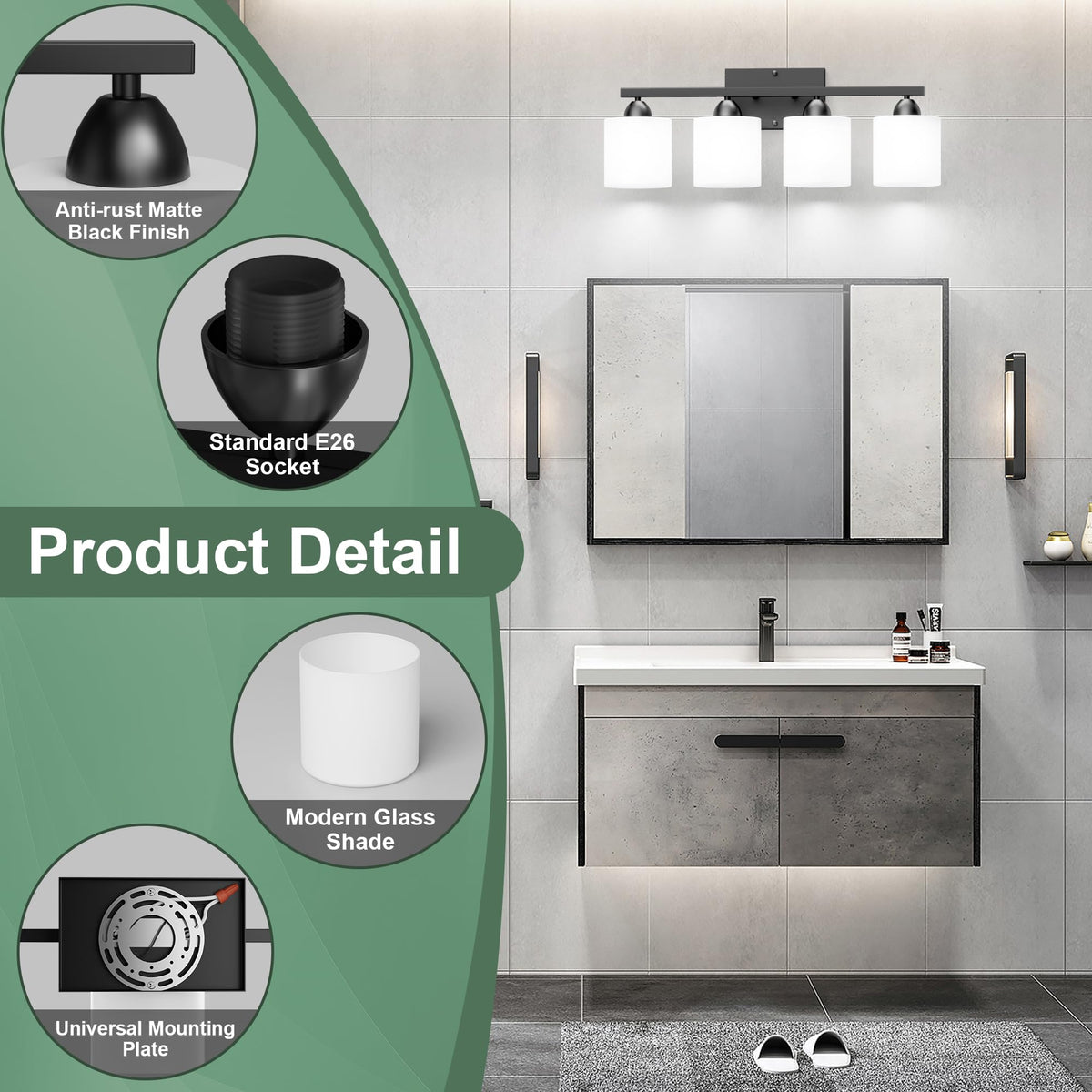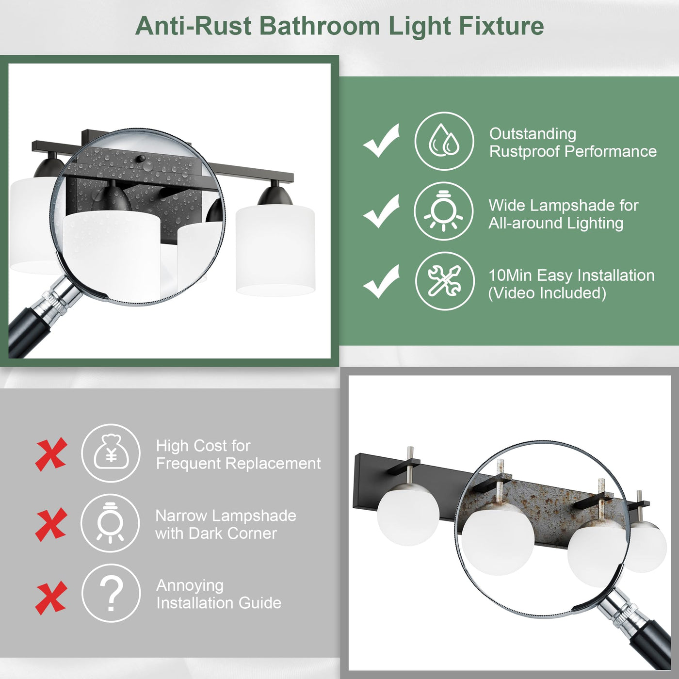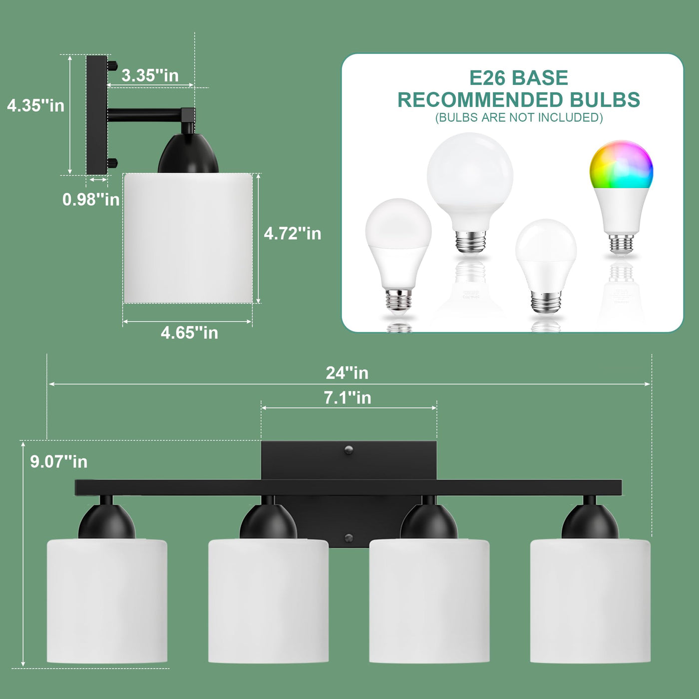 Specification:Bathroom Lights Over MirrorVoltage: 120VMax watt: 60wattMaterial: black and GlassBase: E26 Medium BaseSize: 24x6.69x9.05inchesStyle: Modern/Classic/ MinimalistWhats in the Box?1X Bathroom Vanity Light Fixture4X White Glass Lampshades4XSocket Rings1XMounting Plate4XE26 Standard Socket2XScrew Nuts ;Screw3XWire Nuts1XUser ManualBathroom Light with Anti-rust Black FinishedVanity light fixtures with E26 Standard SocketsBathroom vanity light that work well with most dimmersEasy to installthe bathroom lights over mirrorVanity lights for bathroom, mirror.4-Light Wall Sconces Lighting for bedroom, living room.Warm Tips:1. Please cut off the power supply before installation for your safety.2. Please kindly note that there may have a 0.5in error as the size is measured by hand.