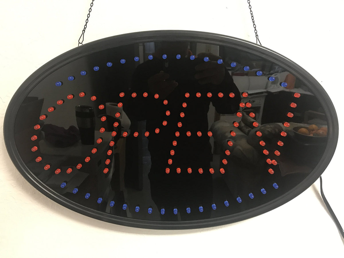 This ultra bright LED sign is ready to use right out of the box. Wire hanger and power cord is included. Just plug it in and get noticed. At a large 24 x 13, (312 square inches) it is 39% larger than the standard 19 x 10 (190 square inches) signs. It has the brightest LED bulbs available, but the LED technology keeps the energy consumption very low. For indoor use only!