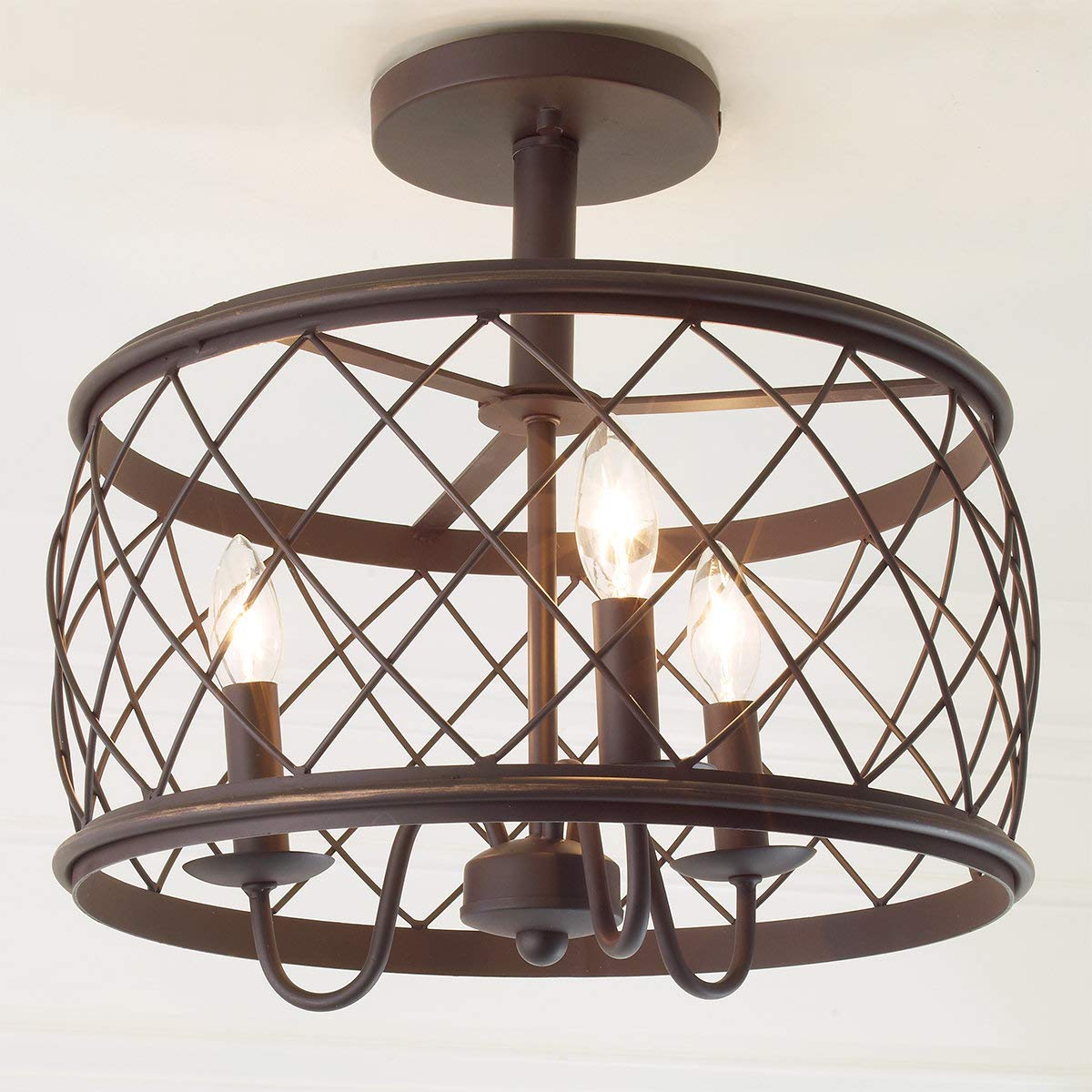 Deluxe Lamp Trellis Cage Semi Flush Mount Light - 3 Light Industrial Style, Metal, Aged Bronze, 15.57 Inch Diameter