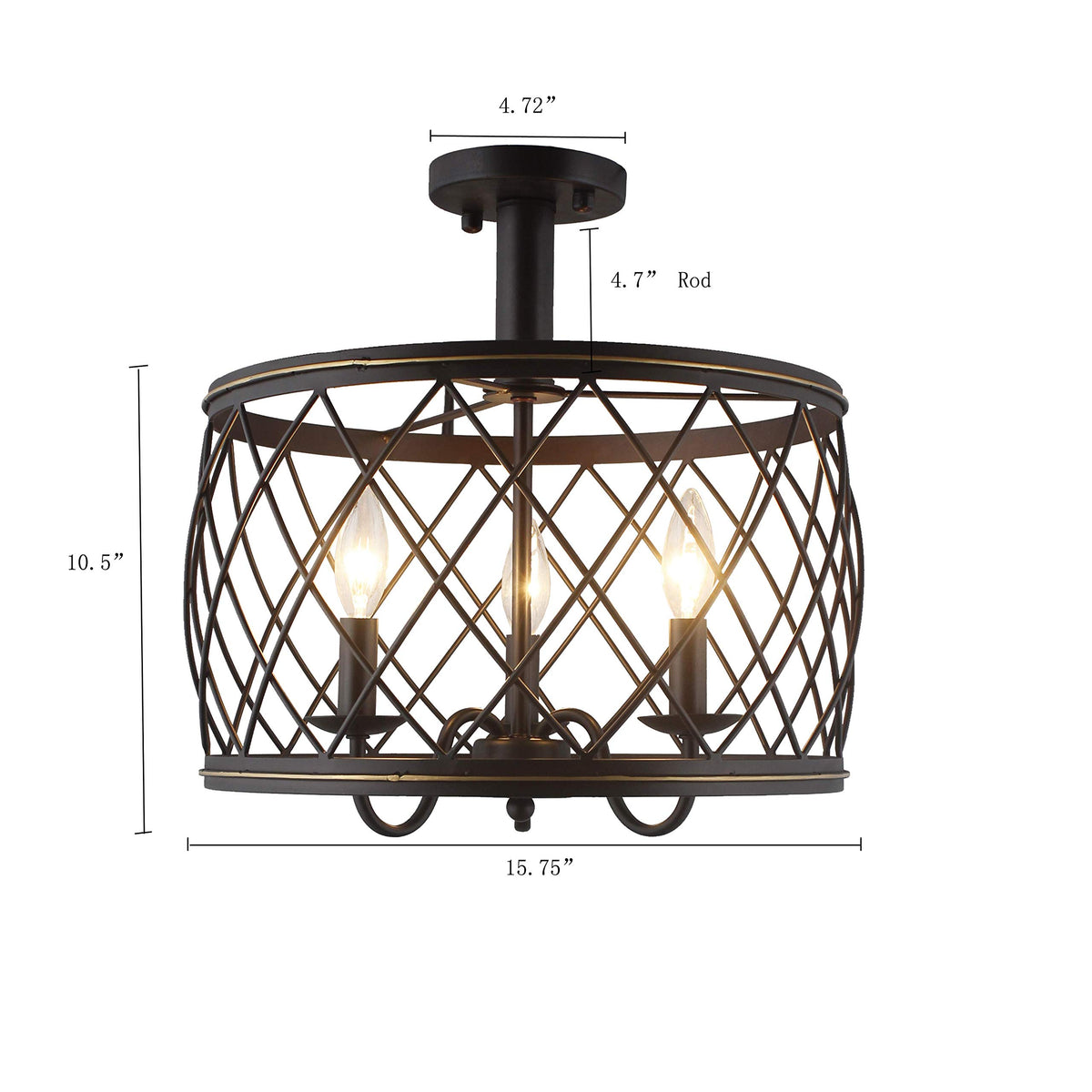 Q: What are the dimensions of the Dia15.57 Inch Trellis Cage Semi Flush Mount Ceiling Light?A: The shade size of the ceiling light is fifteen point seventy-five inches in length and ten point five inches in height, with an additional rod height of four point seven inches.