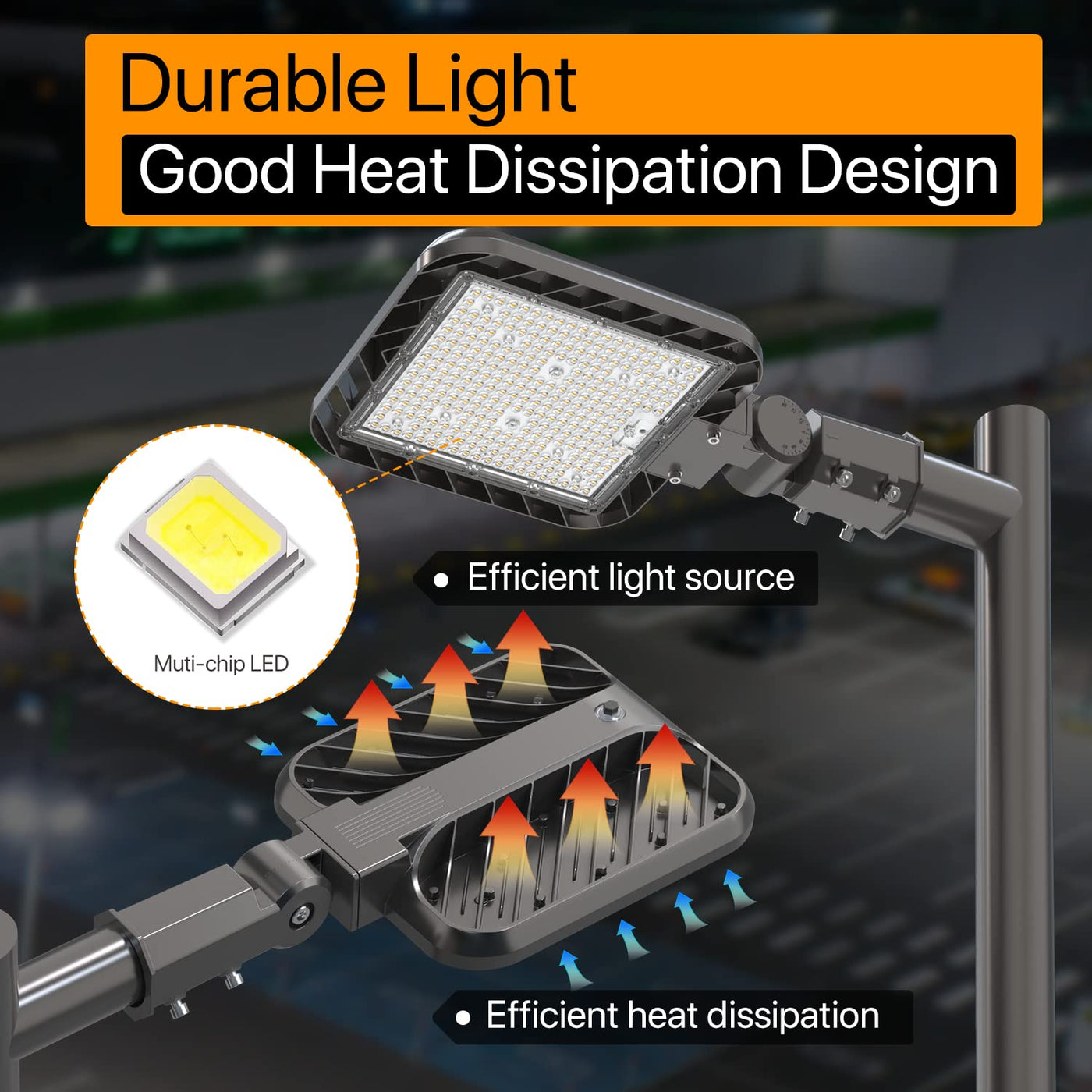 DEMILARE 150W LED Parking Lot Light, a powerful and energy-efficient solution for large outdoor spaces. With a high lumen output of 22,500LM and an impressive efficiency of 150LM/W, this light ensures maximum brightness while reducing energy consumption. Designed with a slip fit mount for easy installation, it’s perfect for parking lots, roadways, stadiums, and other expansive areas. The integrated dusk-to-dawn photocell automatically adjusts the light based on natural daylight, providing seamless operation and energy savings. Built to withstand harsh weather conditions, this light features an IP65-rated housing, ensuring durability and protection against water and dust. Operating on a wide voltage range of 100-277V, and emitting a crisp 5000K daylight white light, the DEMILARE LED Parking Lot Light is the ideal choice for commercial and industrial applications, delivering reliable and long-lasting performance in any environment.
