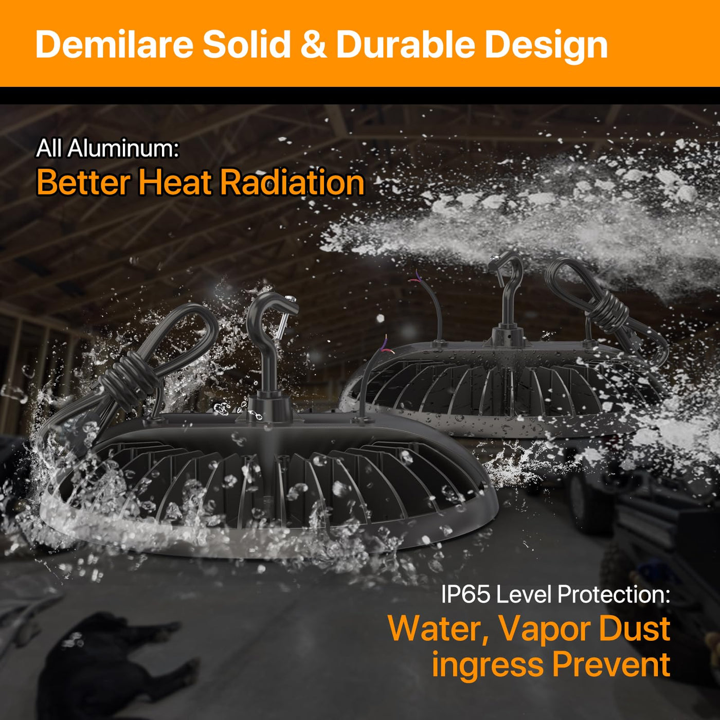 Q: Can these lights be used in outdoor or damp environments?A: Yes, the DEMILARE LED High Bay Lights are rated IP65 waterproof, making them suitable for use in damp locations without compromising performance.