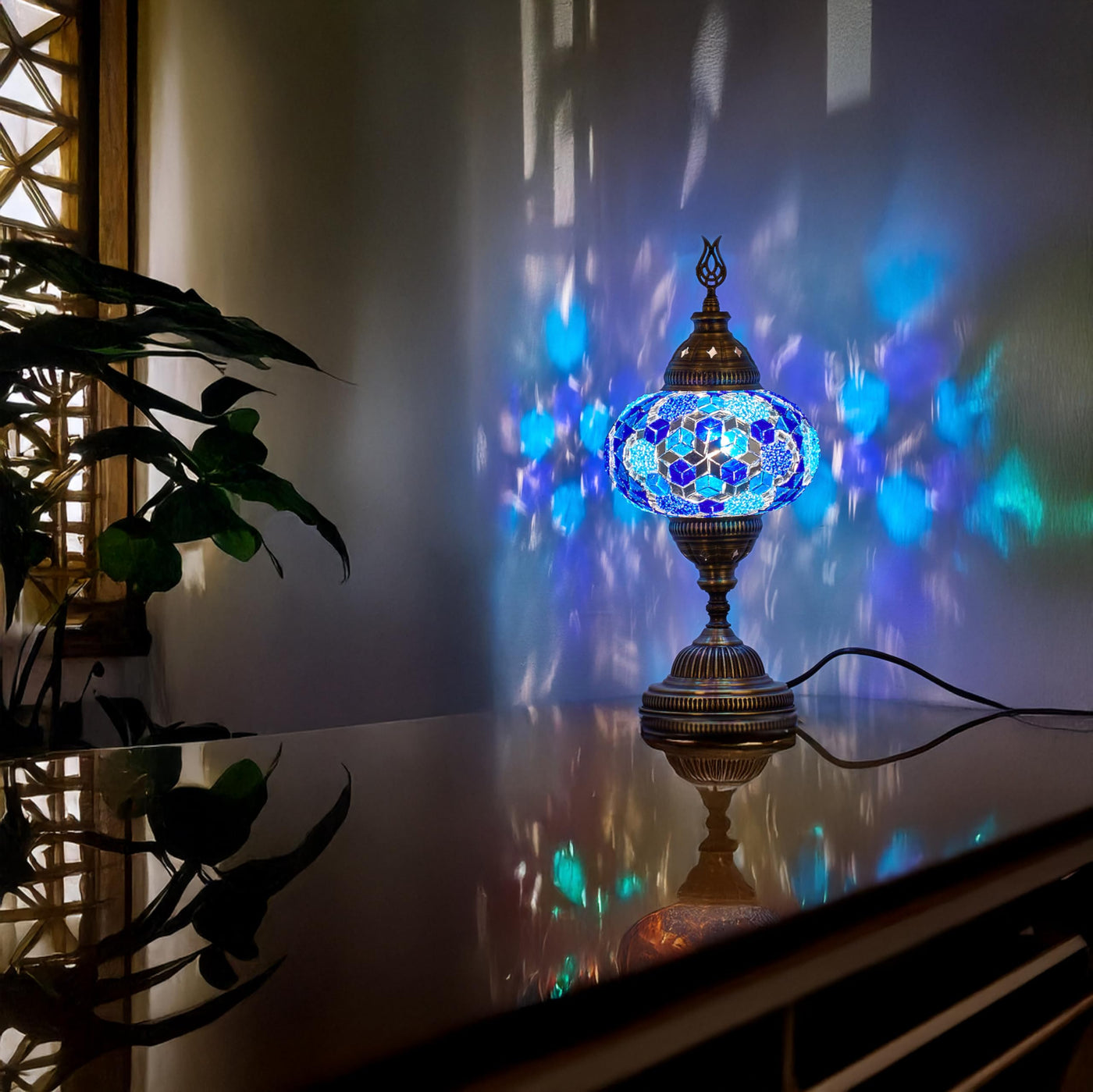Q: Where can I use the Turkish Mosaic Table Lamp?A: This versatile lamp is perfect for use as a nightlight, accent lamp, or centerpiece in various settings like bedrooms, living rooms, patios, or any space where stylish, portable lighting is needed. Its compact size makes it easy to fit on bedside tables, shelves, or desks.