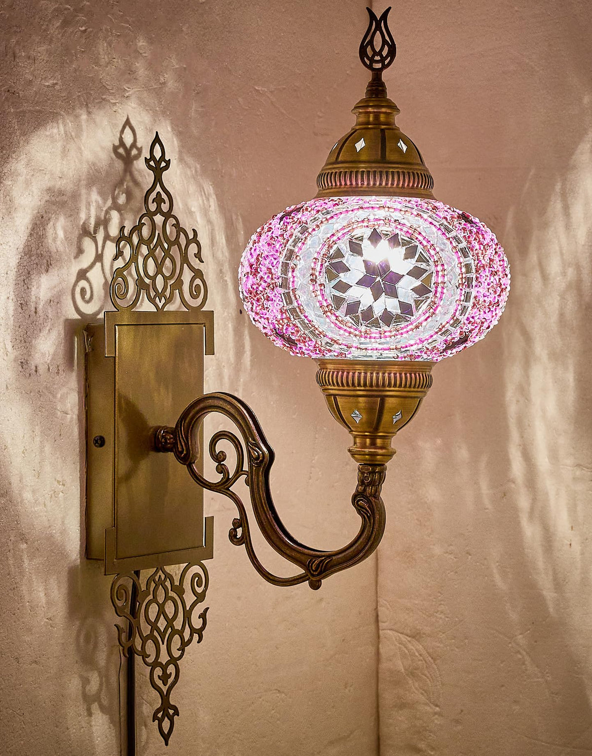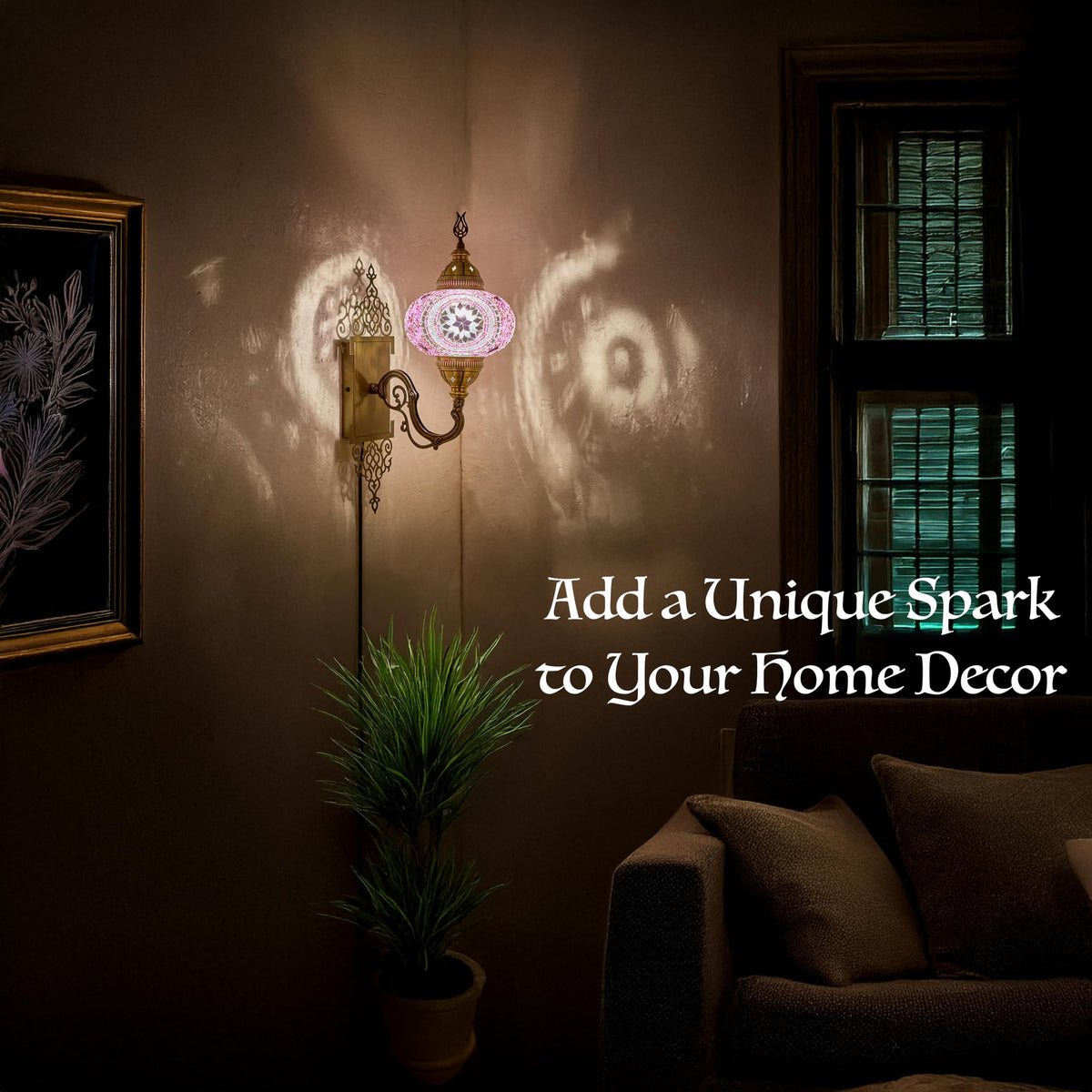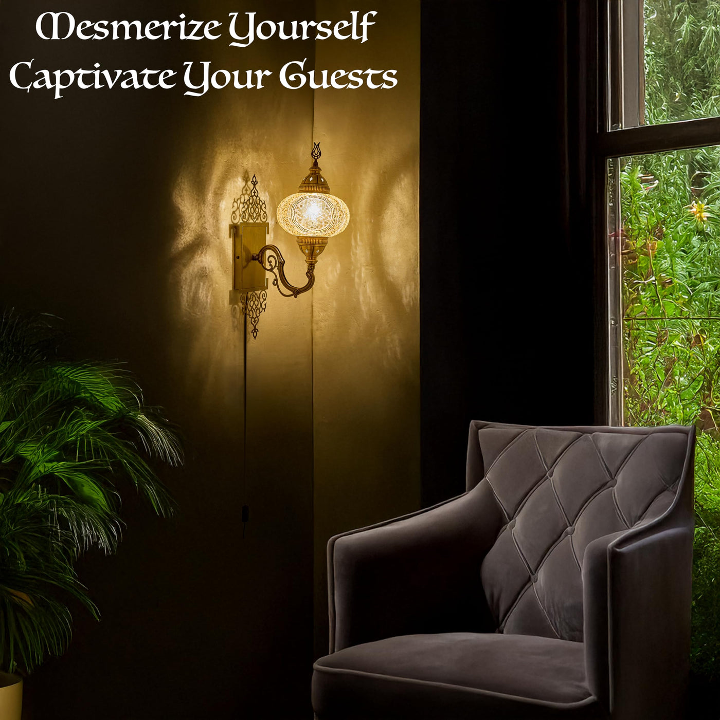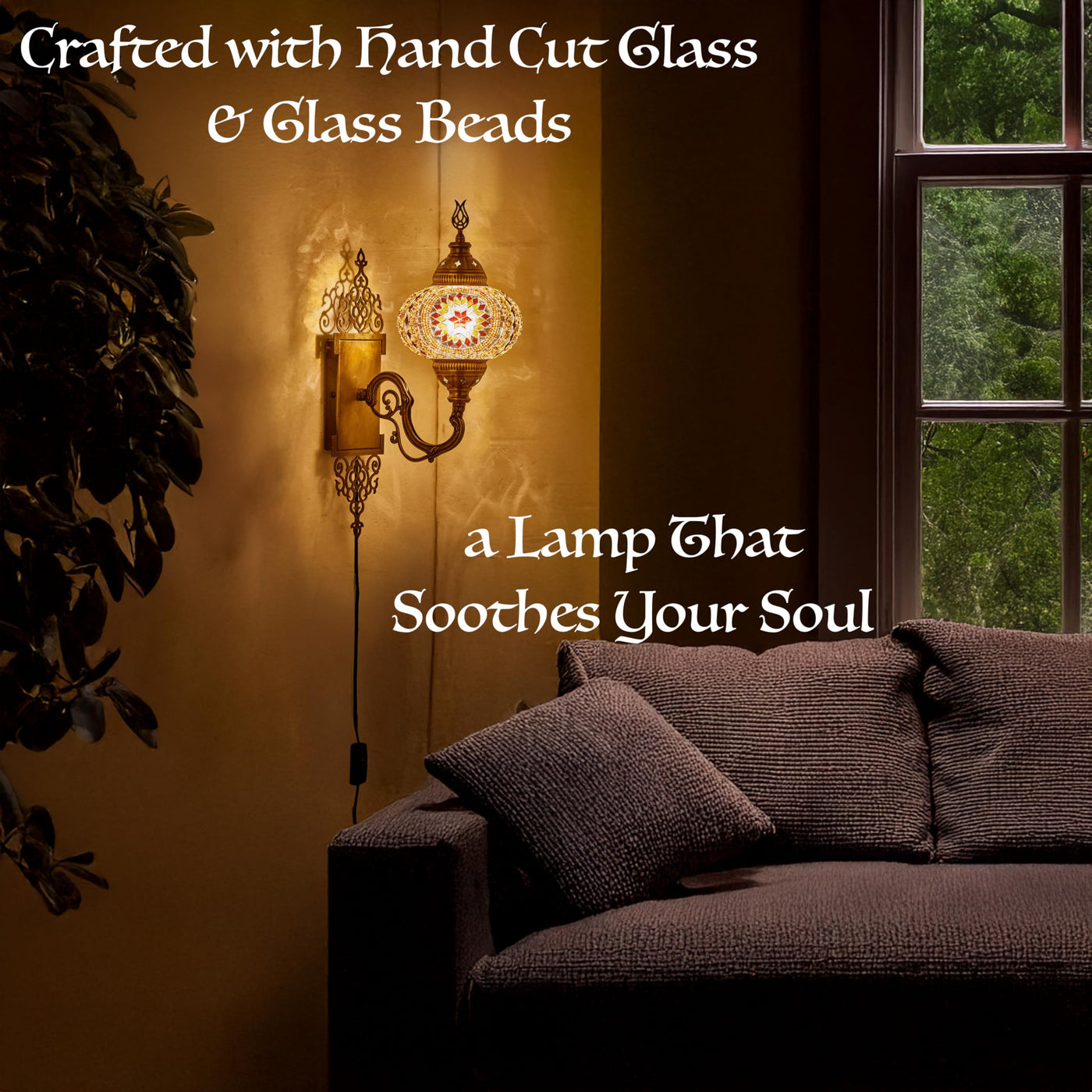Bring a touch of exotic charm to your home with this stunning Turkish Moroccan mosaic plug-in wall sconce. Handcrafted by skilled artisans in Turkey, this sconce features a mesmerizing tiffany-style mosaic glass globe adorned with vibrant, hand-cut glass mosaics and glass beads. The 5.2-foot cord with a plug allows for easy installation, while the 15x5-inch decorated brass base adds an elegant touch. This unique lighting fixture is not only a functional work of art but also a conversation piece that will captivate your guests. With its intricate detailing and warm, inviting glow, this sconce is perfect for adding a touch of bohemian flair to any room.